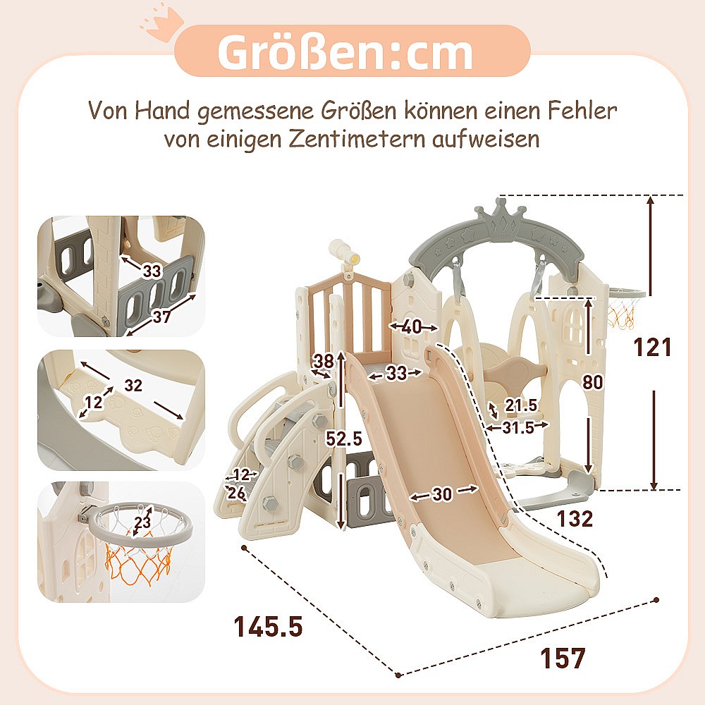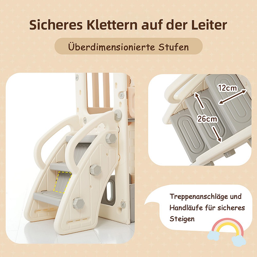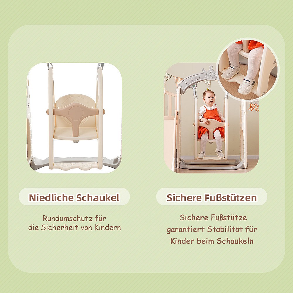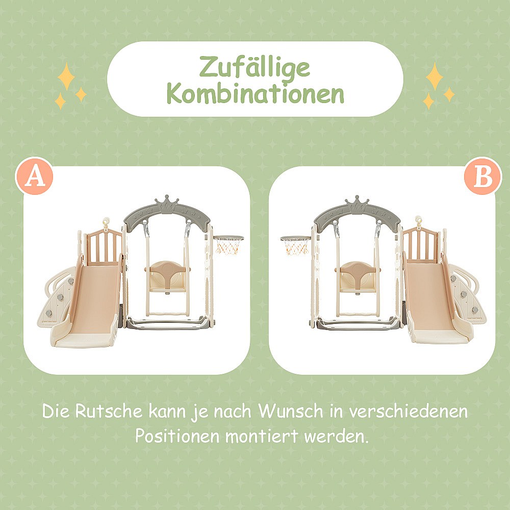 5-in-1 speeltoestel met schommel, glijbaan, ladder, mand, telescoop en opbergruimte, voor binnen- en buitengebruik.