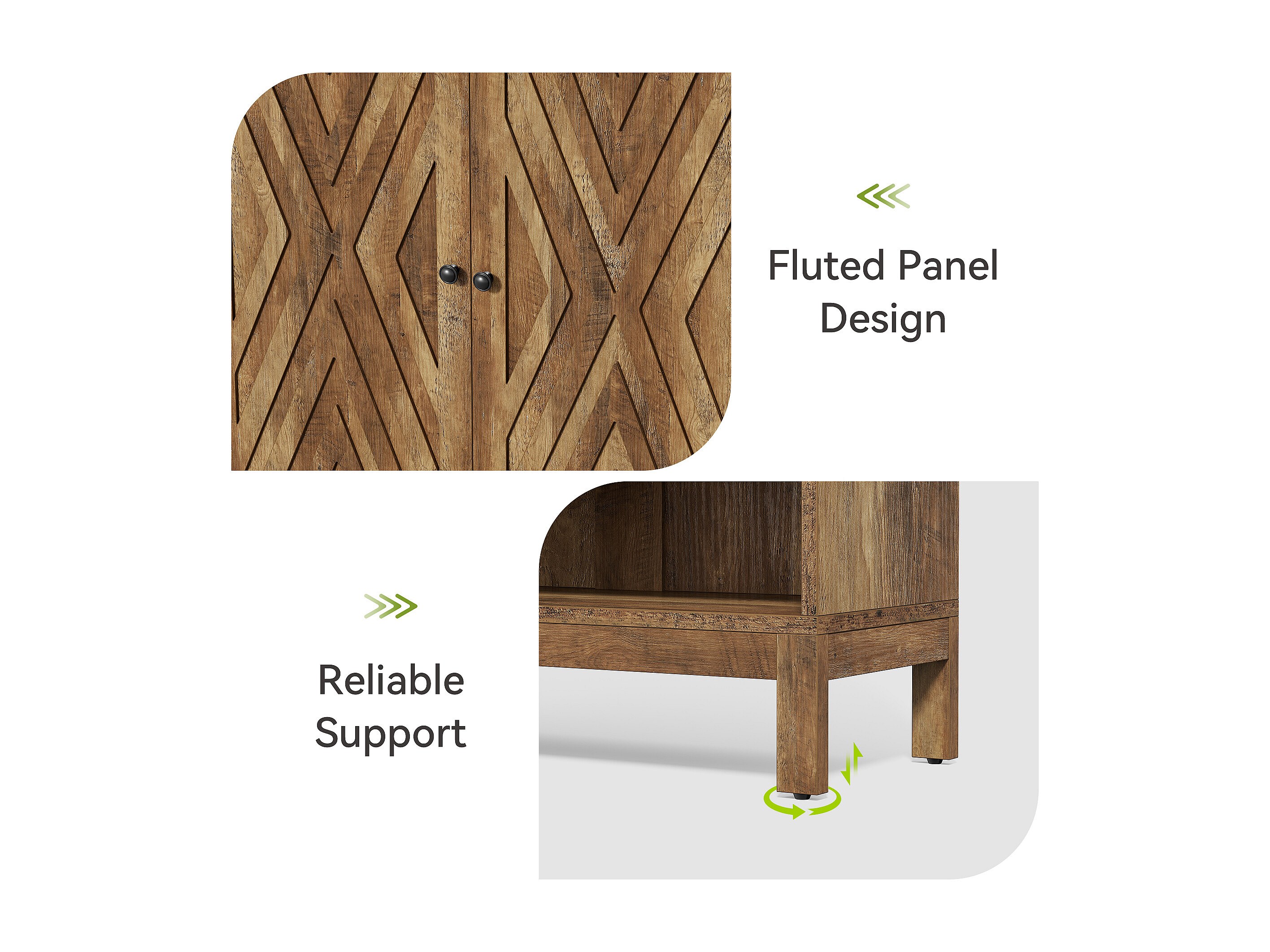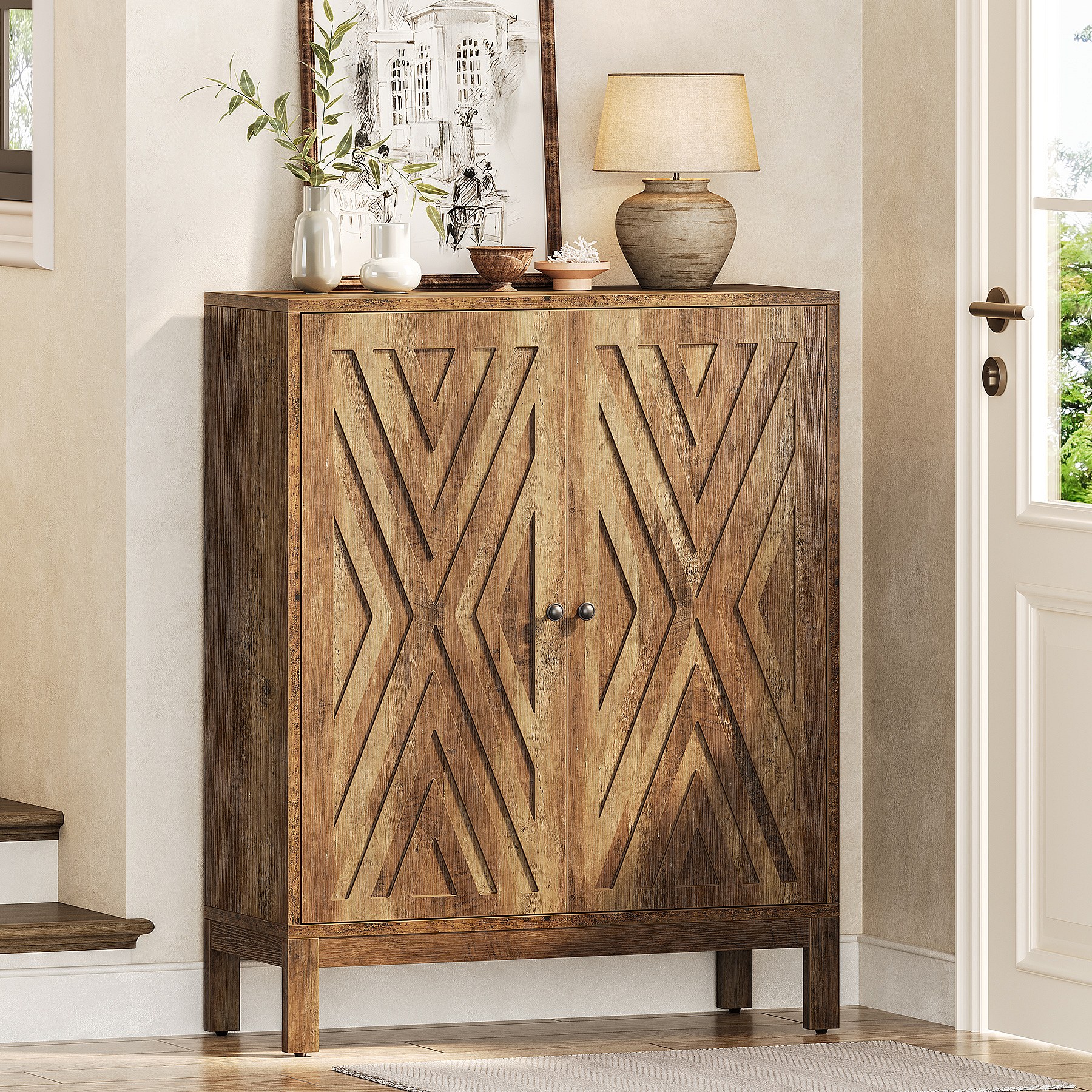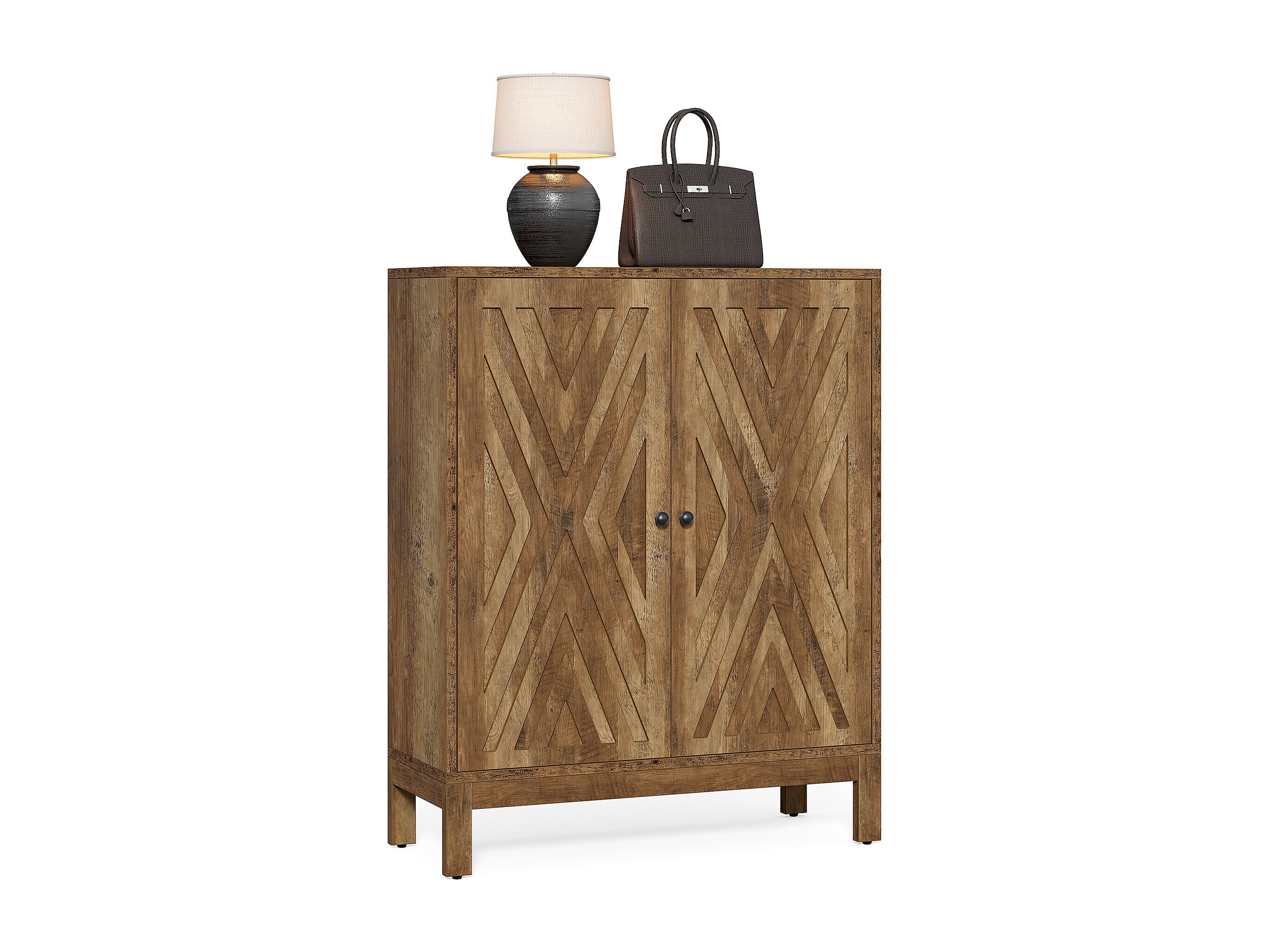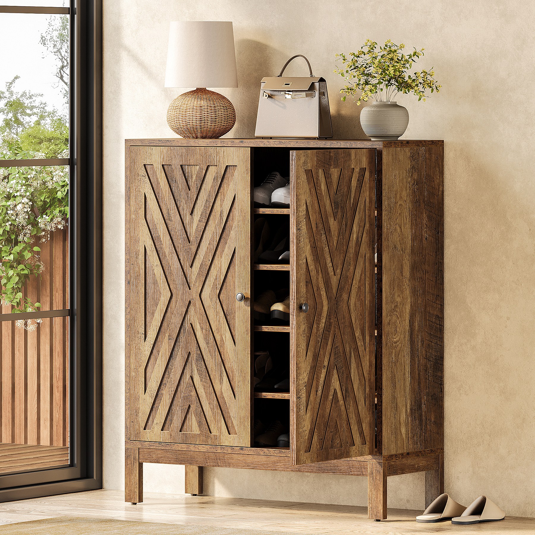 Schoenenkast voor de hal met 2 klapladen, smalle houten schoenenkast met gecanneleerd paneel