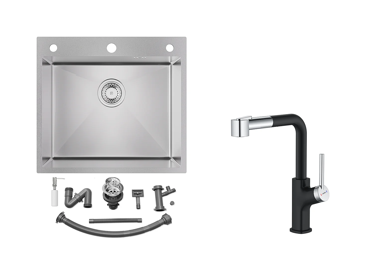 54*49*20 CM keuken spoelbak, inbouw/blad met zeepdispenser, zilver + zwarte keukenkraan met uittrekbare handdouche, 2 stralen