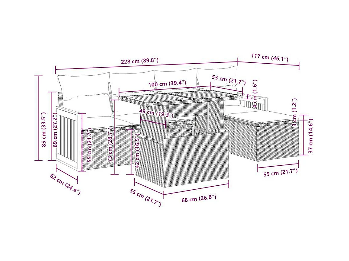 5-delige Loungeset met kussens poly rattan lichtgrijs