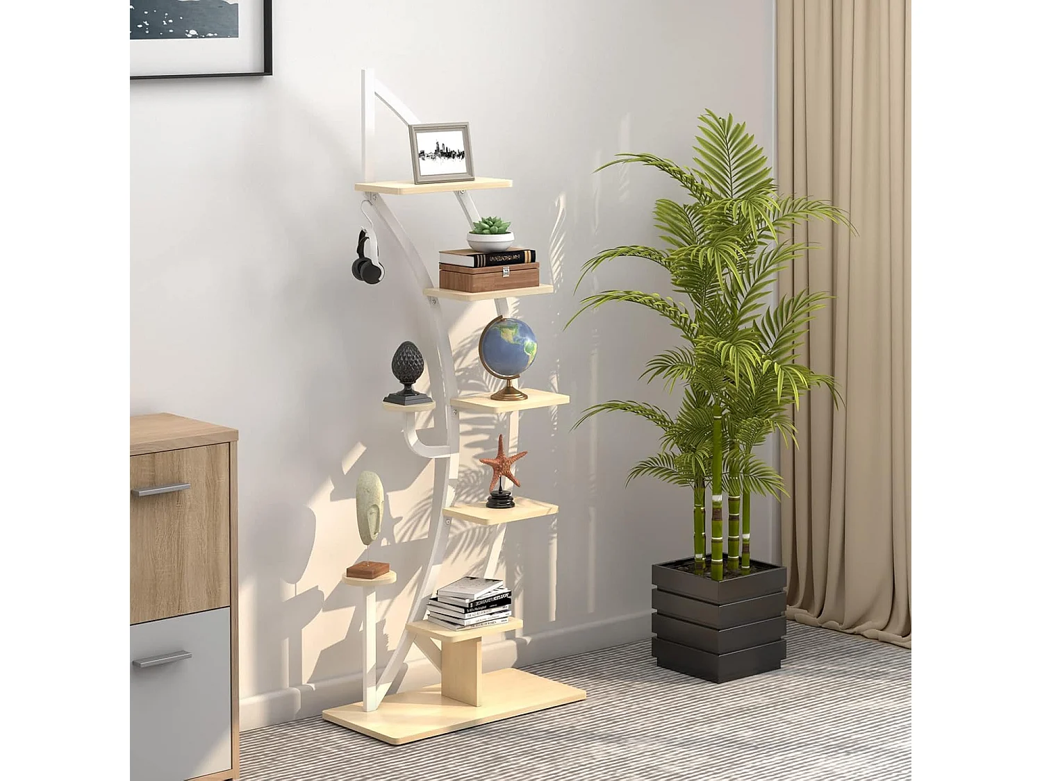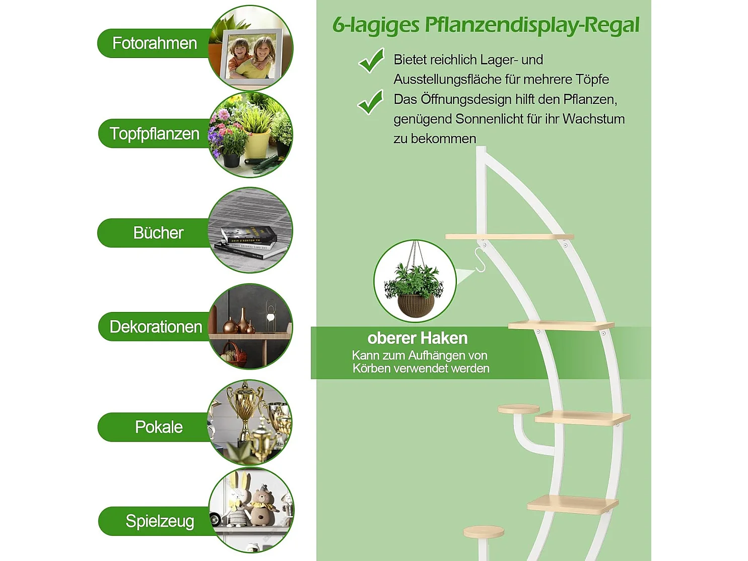 6-traps metalen plantenstandaard in halve maanvorm, bloemenrek met 2 kleine planken en bovenste haken,bloempotstandaard voor tuin, woonkamer (1 stuks)TL32291