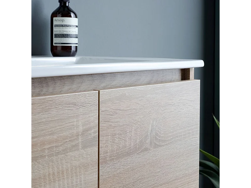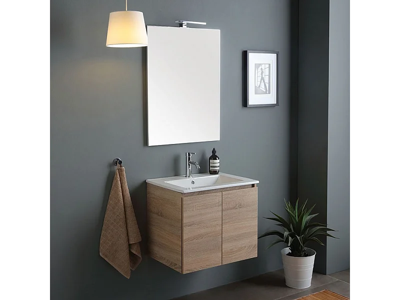 60cm "Belize" eikenhouten wandbadkamerkast met 2 keramische wastafeldeuren en 60x80cm spiegel