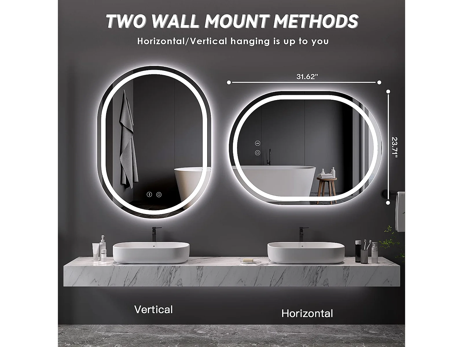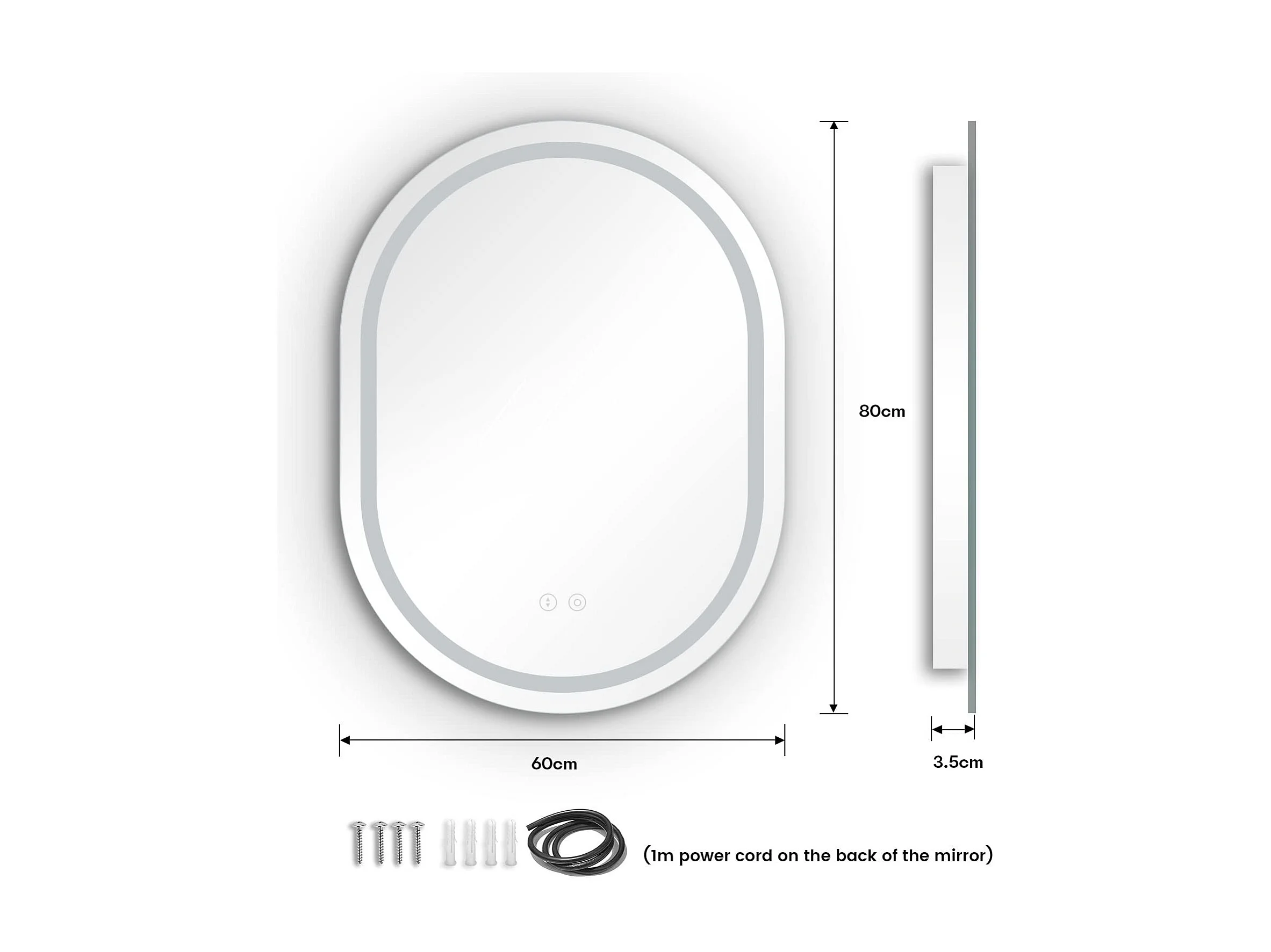 60x80cm ovale LED spiegel met verlichting, anti-condens, dimbaar 3 kleuren, verstelbare badkamer- en make-upspiegel met aanraakschakelaar