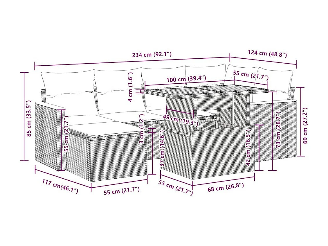 7-delige Loungeset met kussens poly rattan acacia grijs