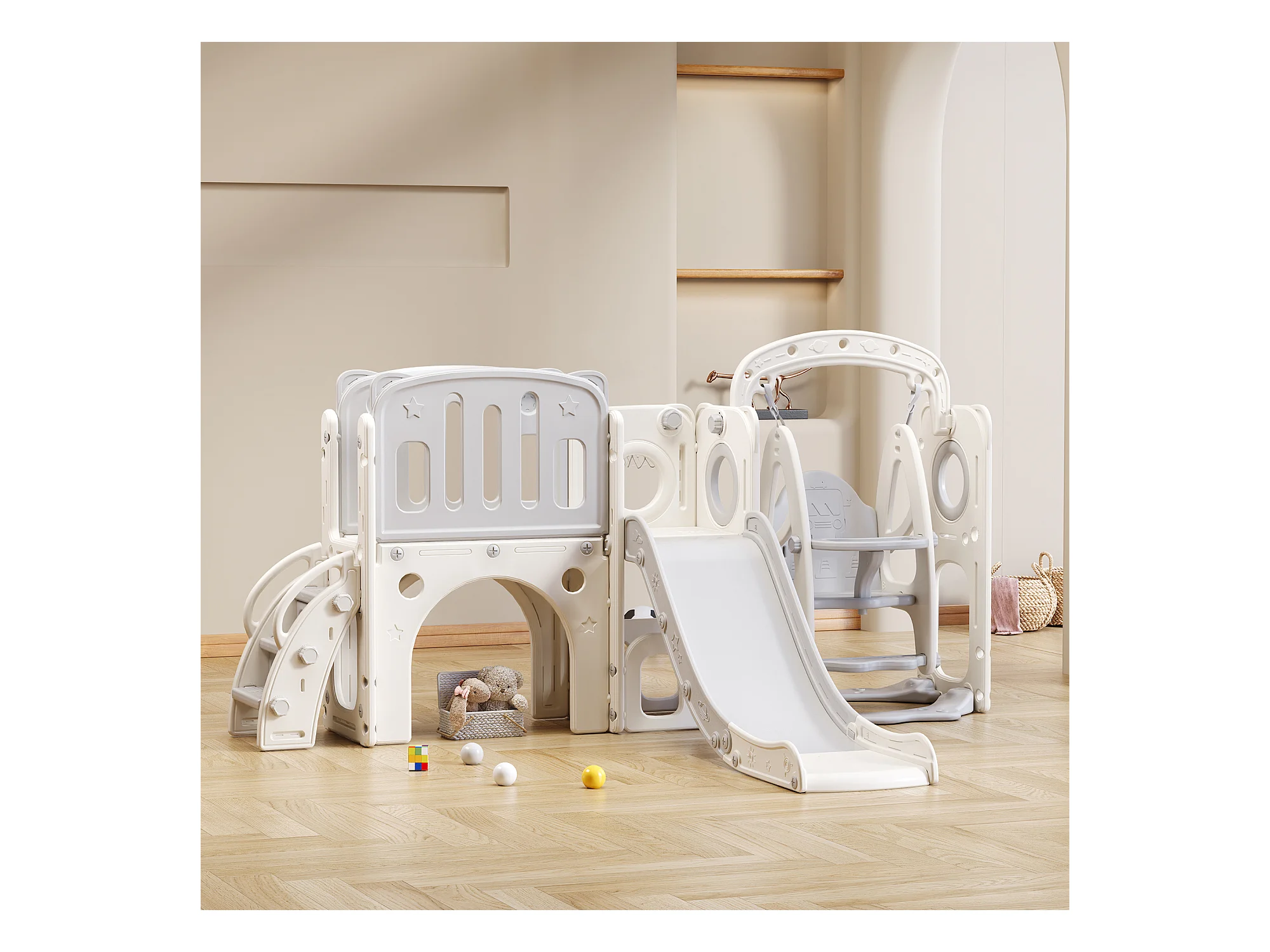 6 in 1 kinderglijbaan - bestaande uit een glijbaan, een basketbalring, een trap, een tunnel en twee opbergruimtes - Polyethyleen - Lichtgrijs