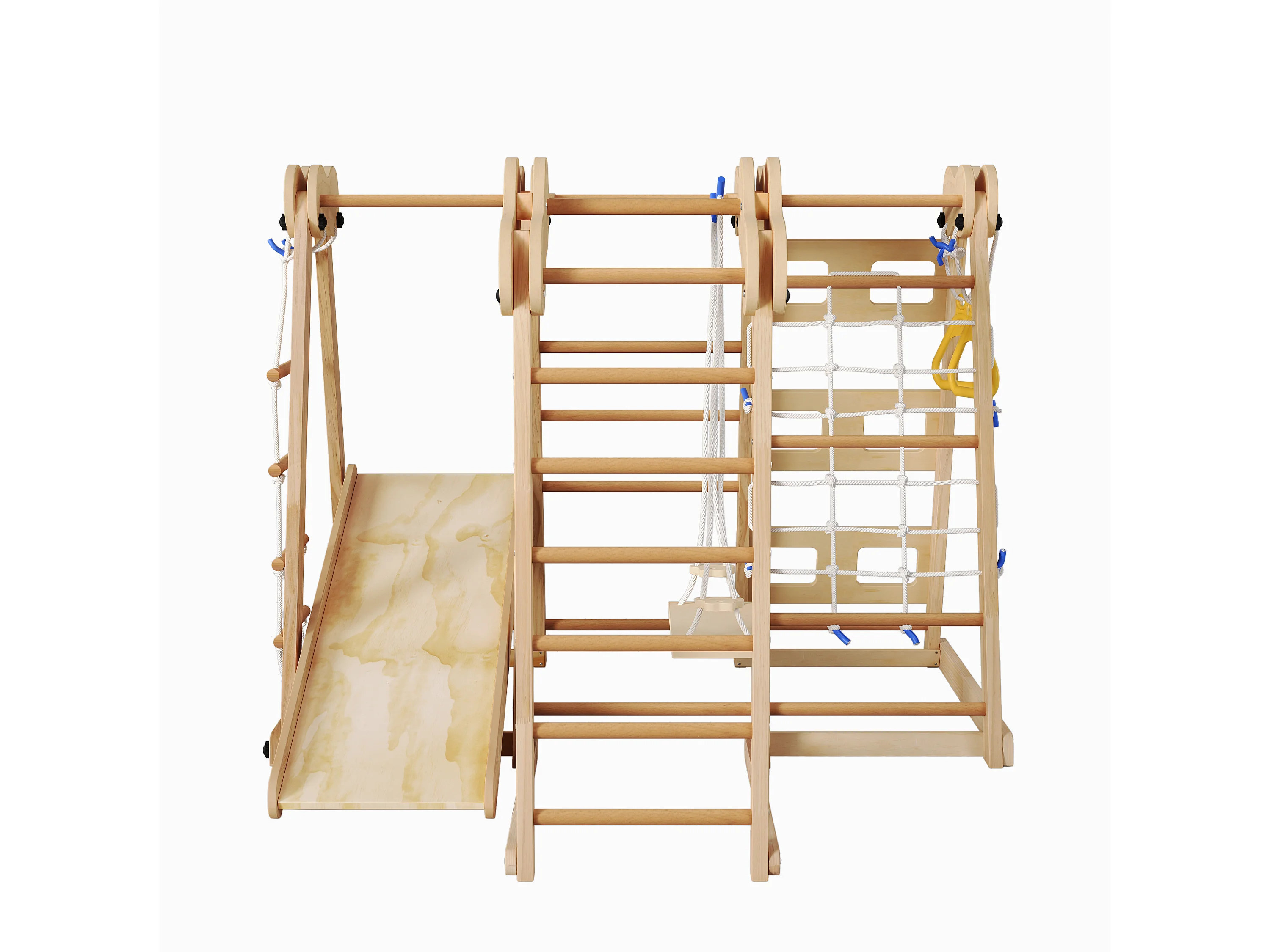 7-in-1 opvouwbare kinderschommel - 128 x 164 x 116 cm - Houten materiaal - met glijbaan en klimrek - Natuurlijk