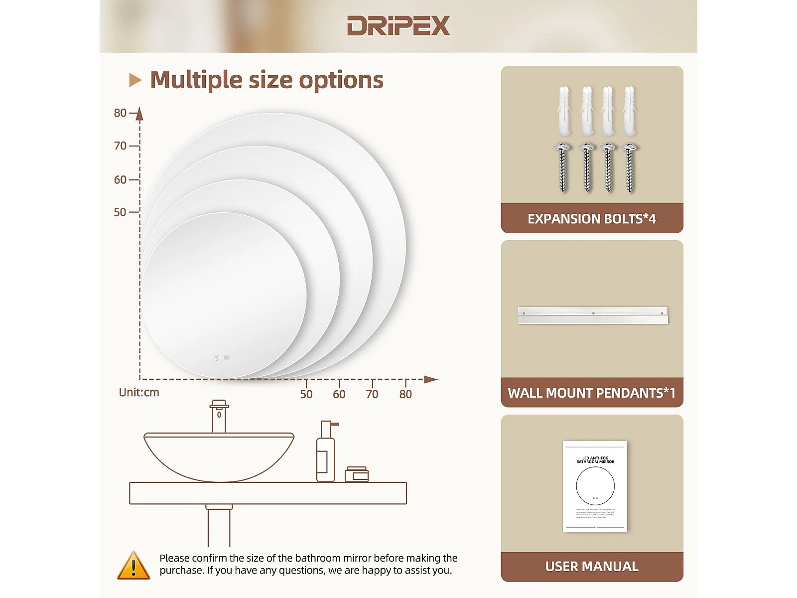 70cm badkamerspiegel, ronde anti-condens led-spiegel, 3 kleuren, dimbaar, touchschakelaar