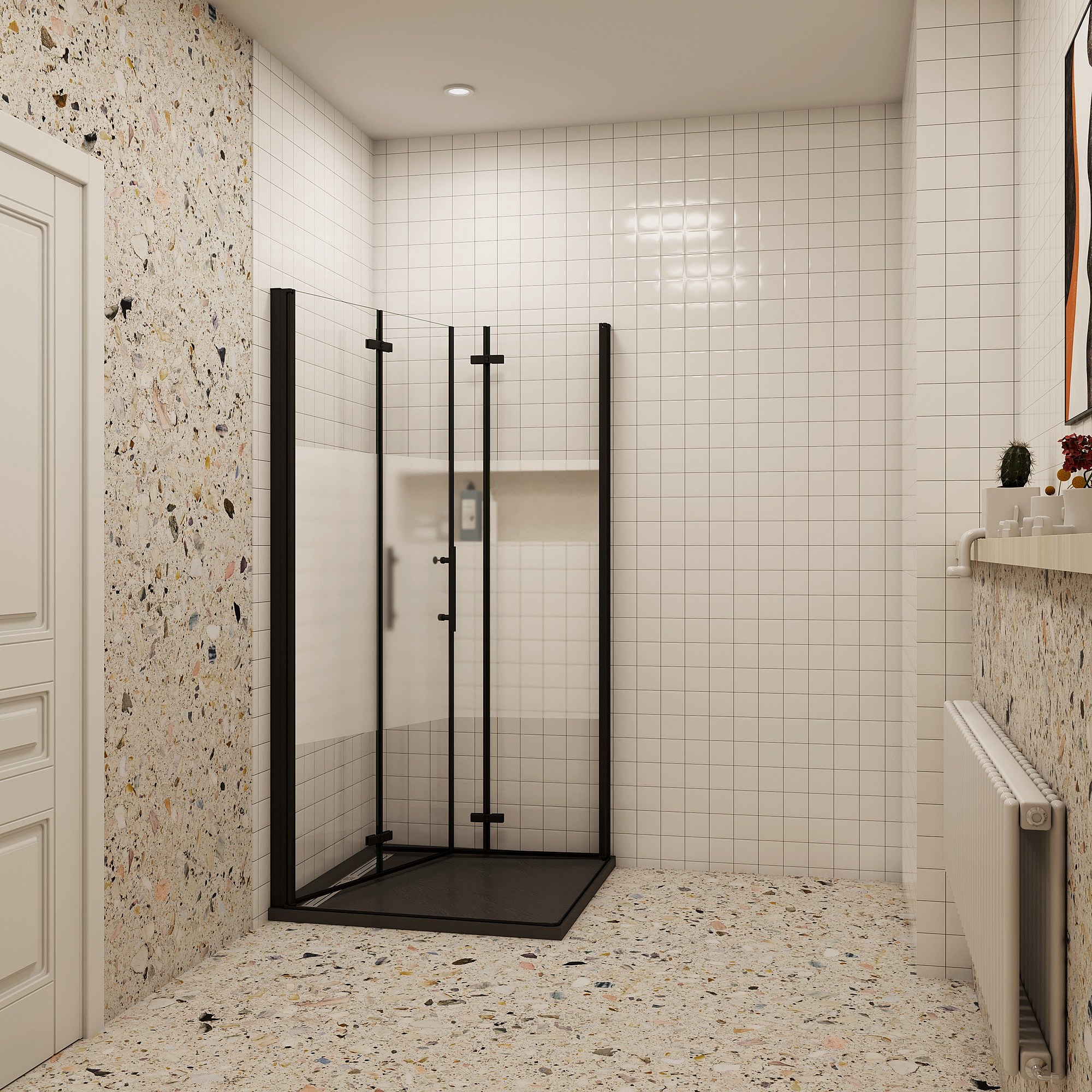 70x76x195cm douchecabine met inklapbare vouwdeur en vaste zijwand, 6mm helder EasyClean veiligheidsglas,mat zwarte aluminium frame, stabilisatiestang 50 cm