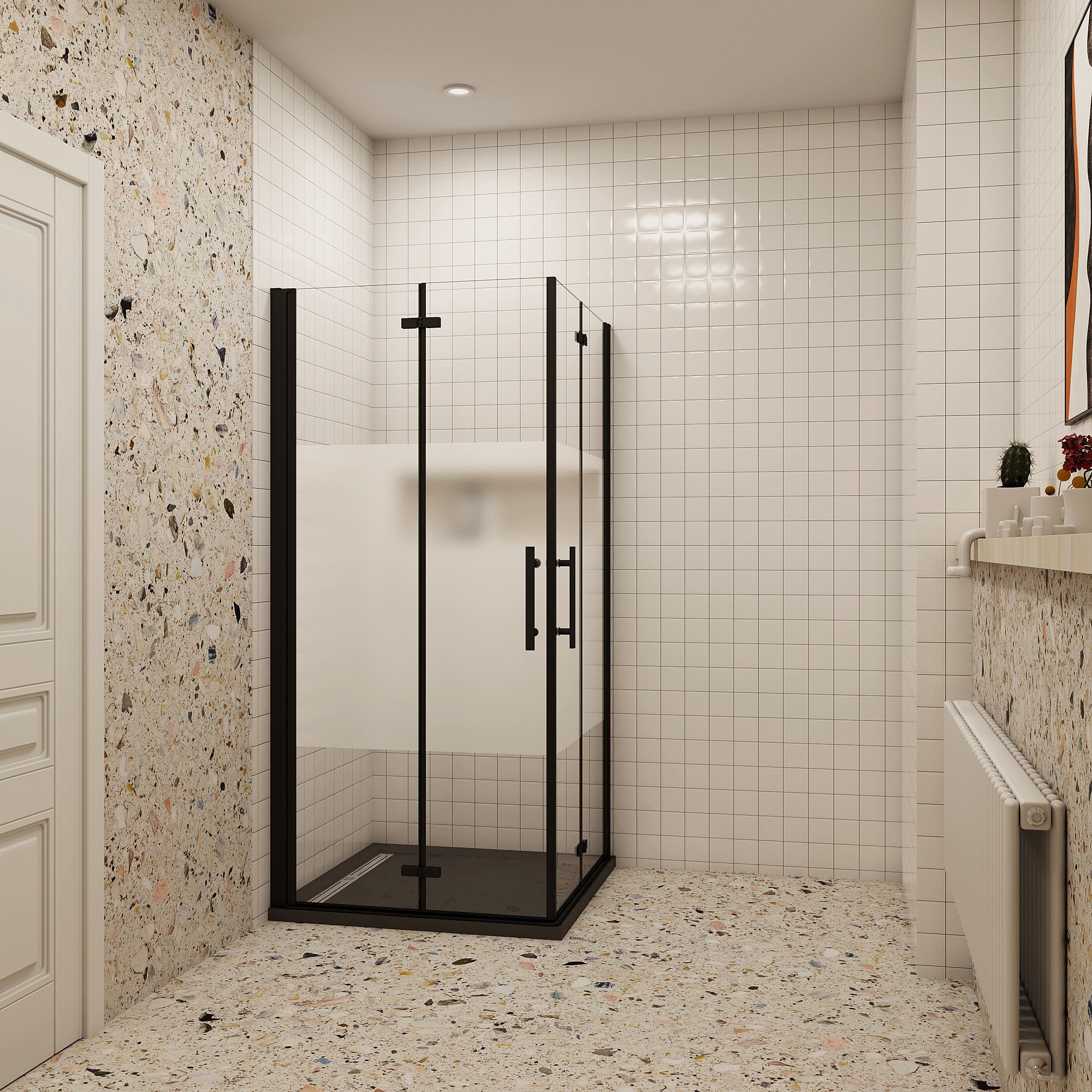 76x76x195cm Douchecabine Vierkant Hoekinstap Draaideur Antikalk Helder Glas Mat Zwart Profiel 6mm Veiligheidsglas Easy Clean,ondoorzichtige matte middenstrook