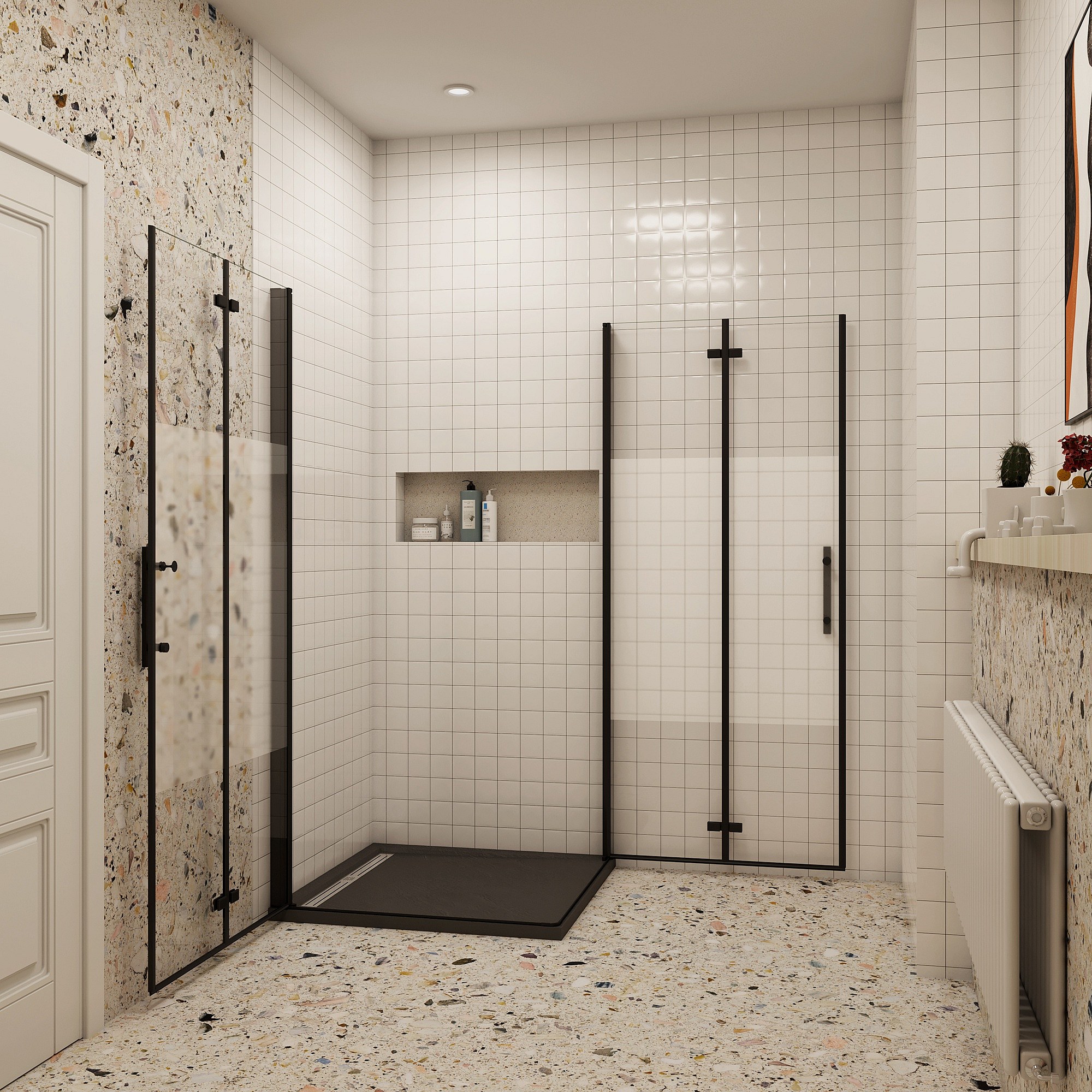 76x80x195cm douchecabine met inklapbare vouwdeur en vaste zijwand, 6mm helder EasyClean veiligheidsglas,mat zwarte aluminium frame, N-vorm 90cm Stabilisatiestang