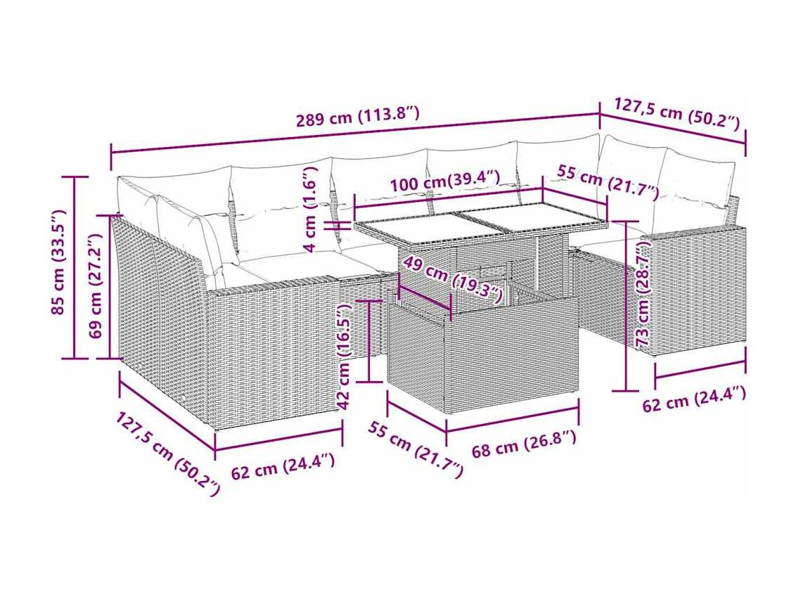 8-delige Loungeset met kussens poly rattan grijs