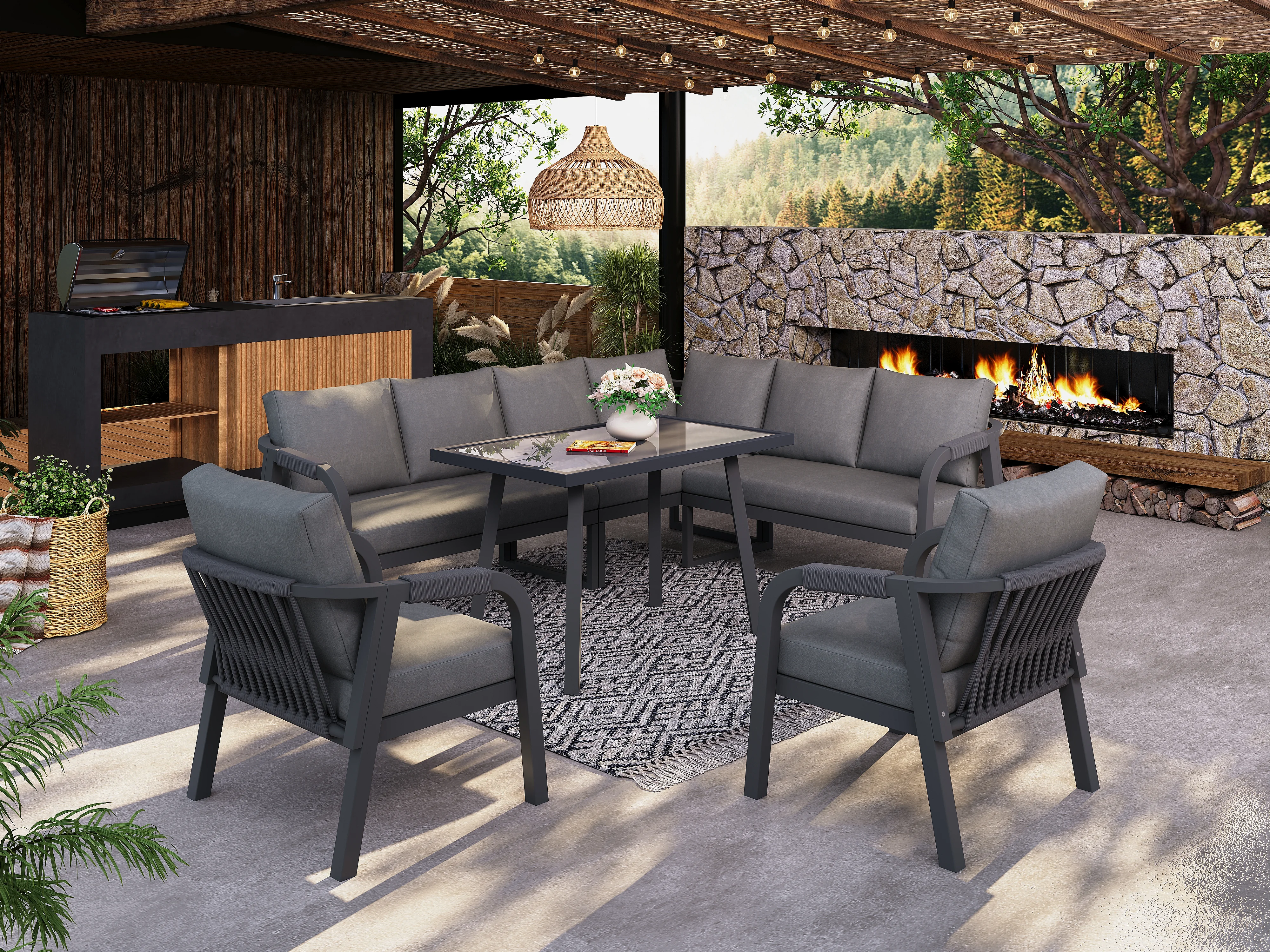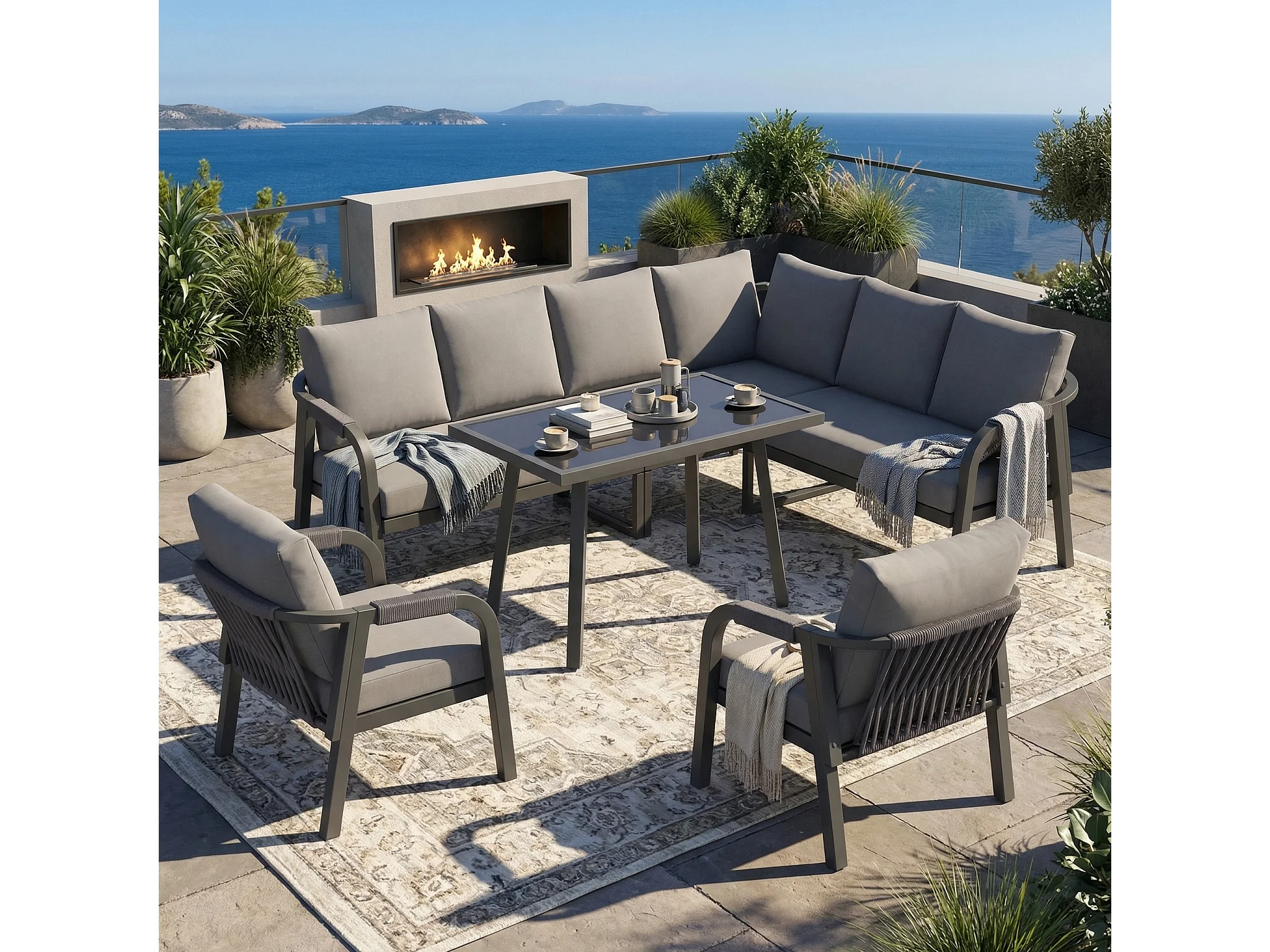 8-persoons tuinset - met geweven armleuningen en rugleuningen + bank + tafel + 2 fauteuils - metaal - grijs