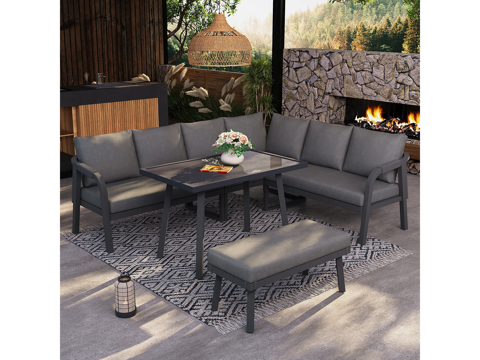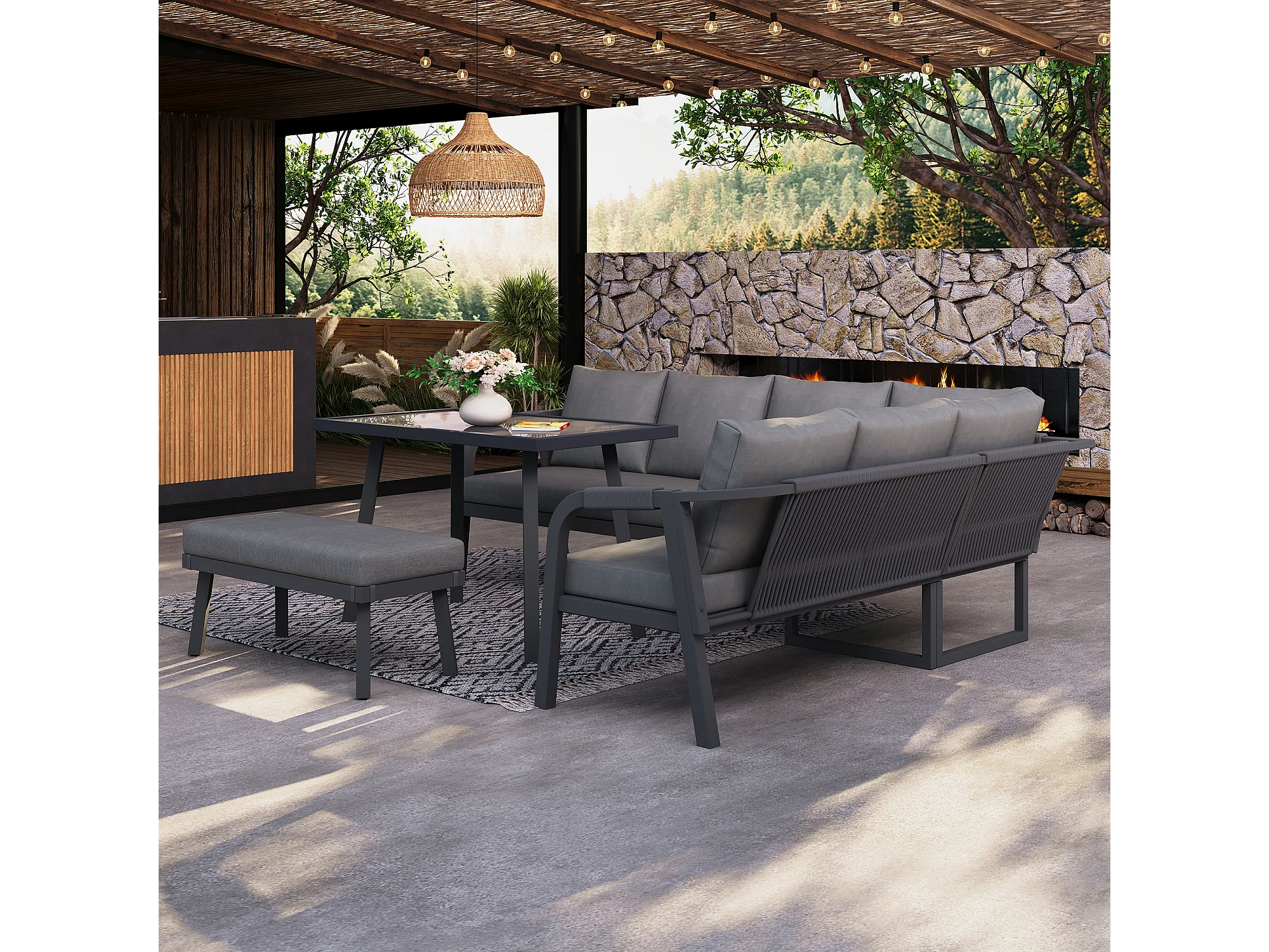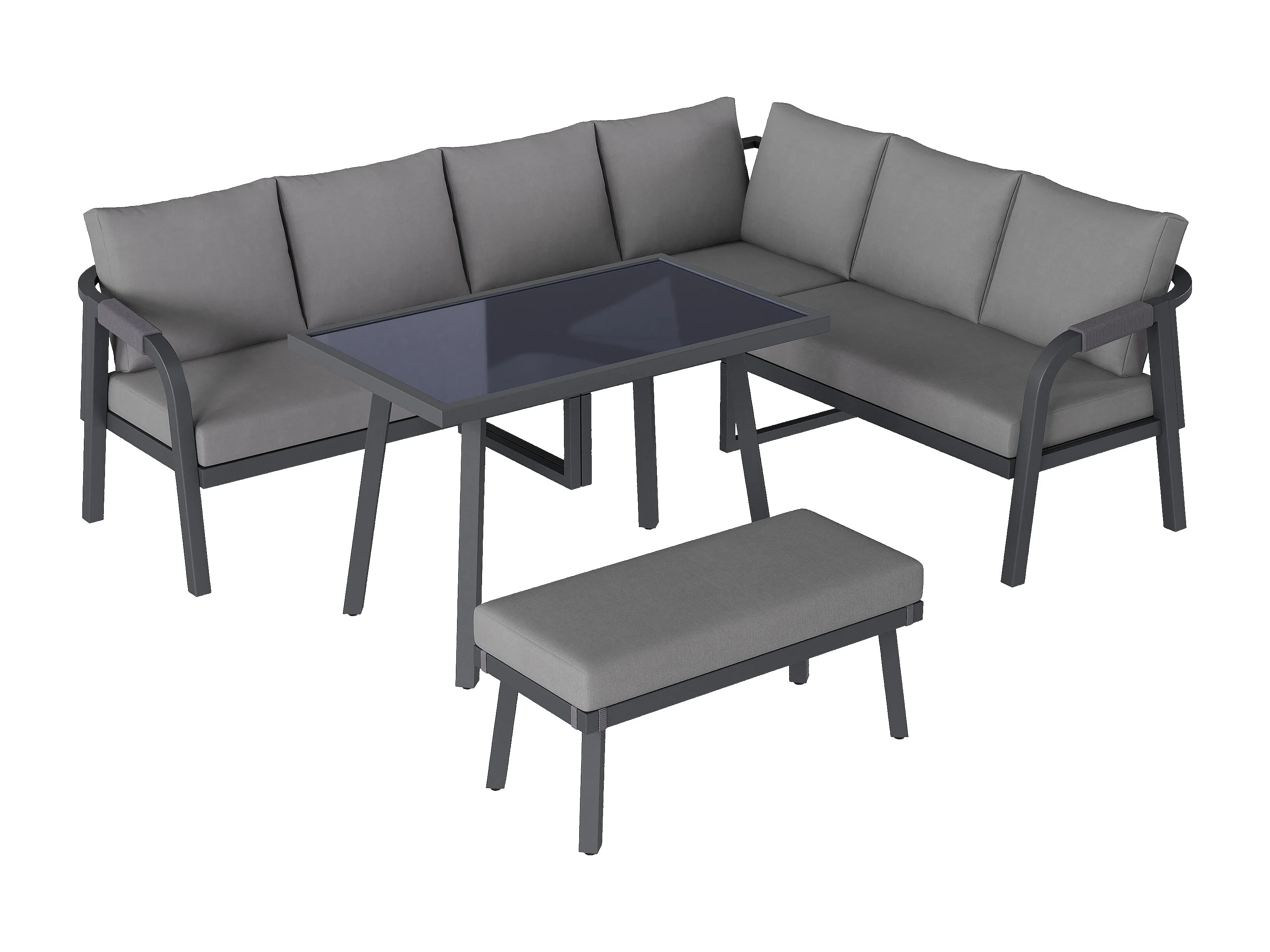 8-persoons tuinset - met geweven armleuningen en rugleuningen + hoekbank + tafel + zitbank - metaal - grijs