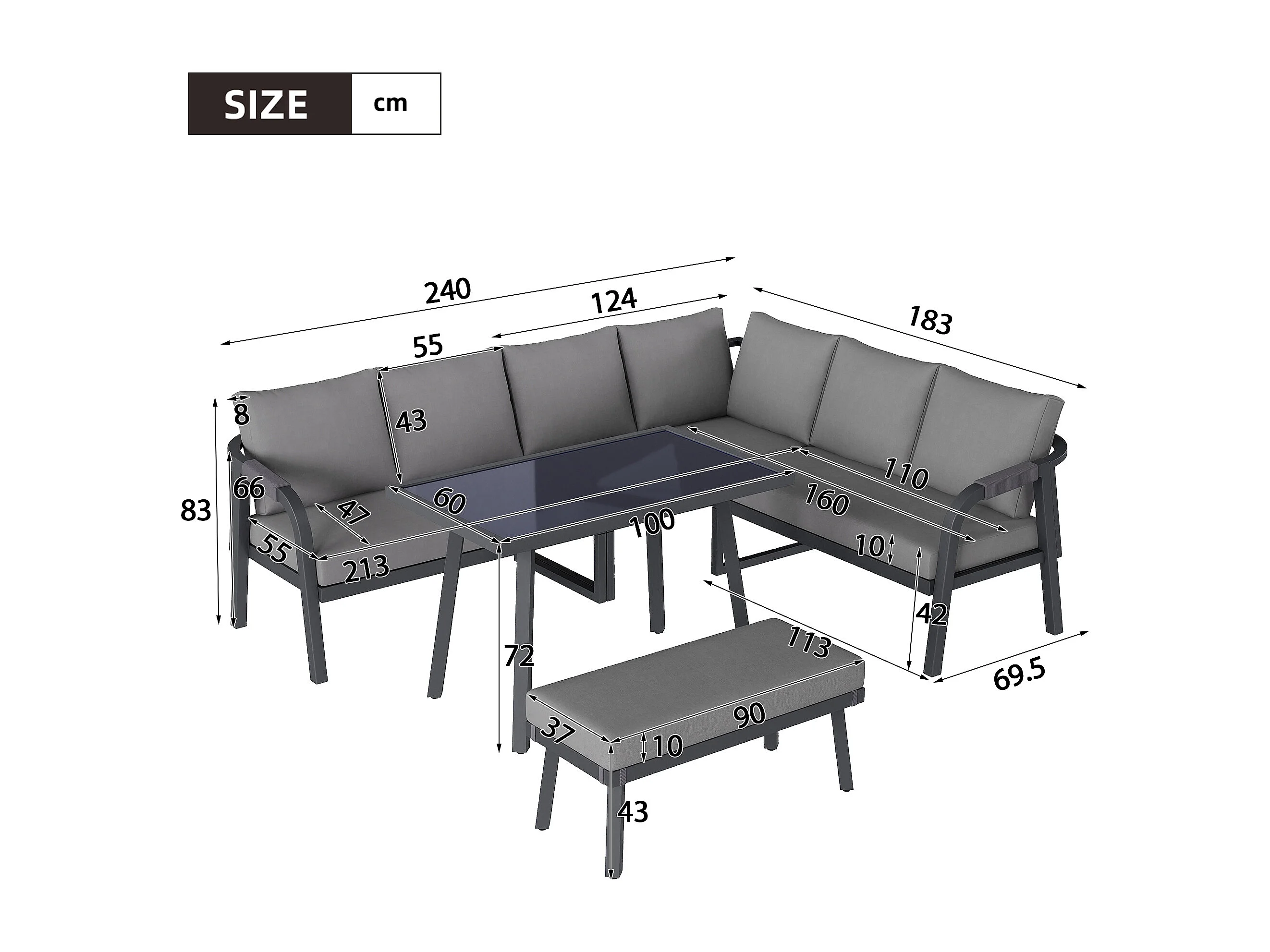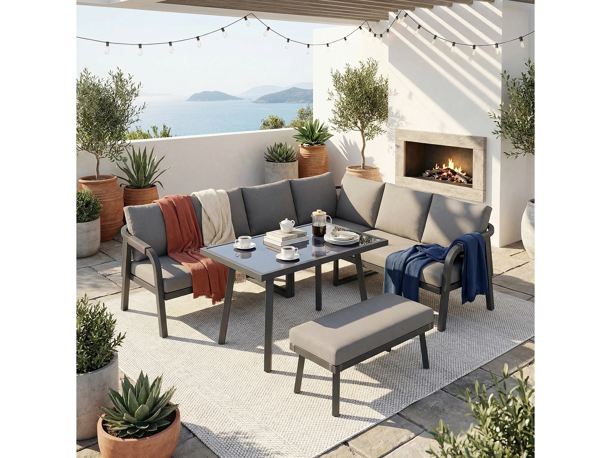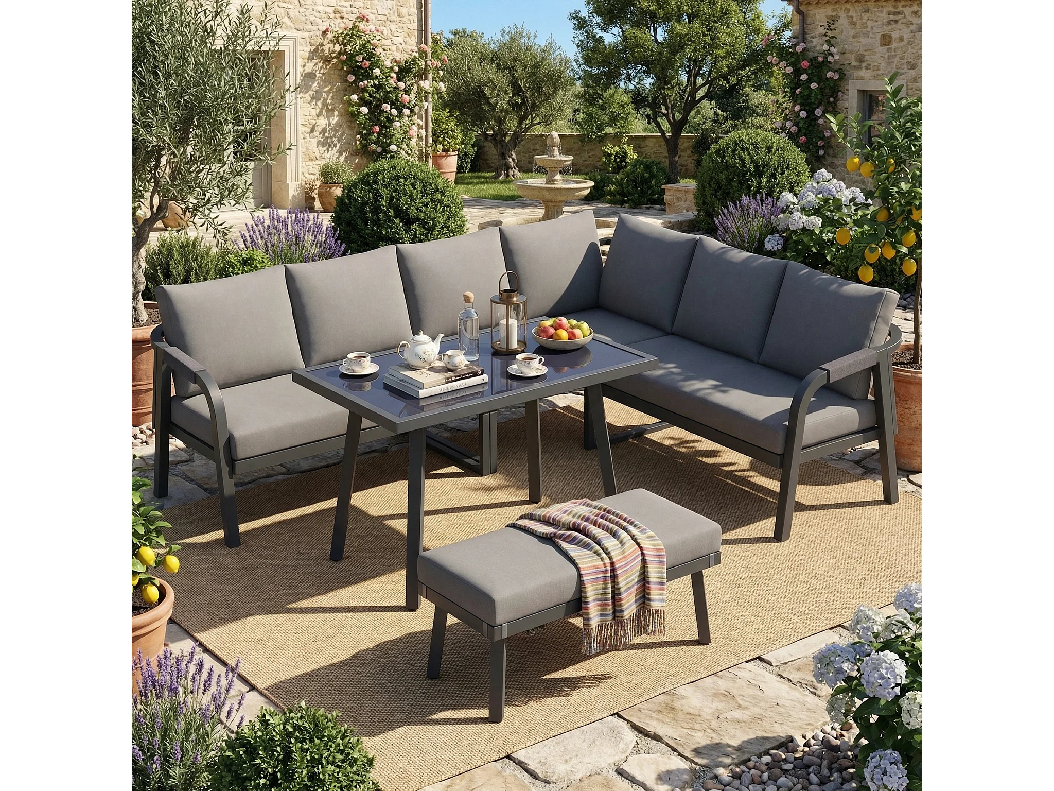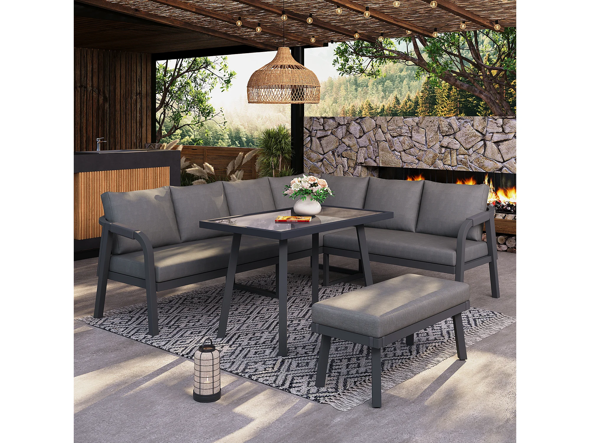 8-persoons tuinset - met geweven armleuningen en rugleuningen + hoekbank + tafel + zitbank - metaal - grijs