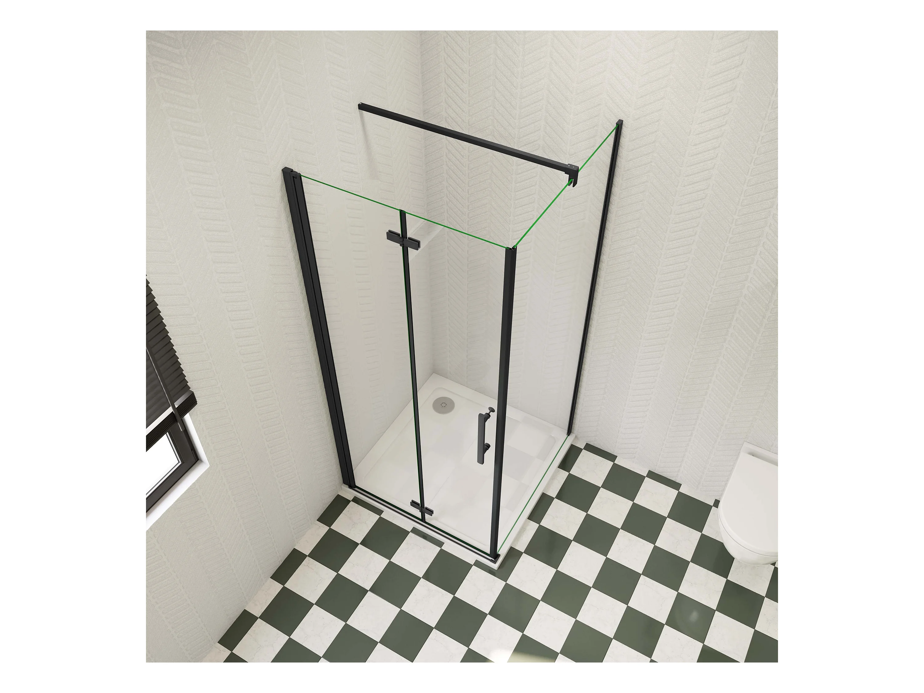 85x80x195cm douchecabine met inklapbare vouwdeur en vaste zijwand, 6mm helder EasyClean veiligheidsglas,mat zwarte aluminium frame, F-vorm 90cm Stabilisatiestang