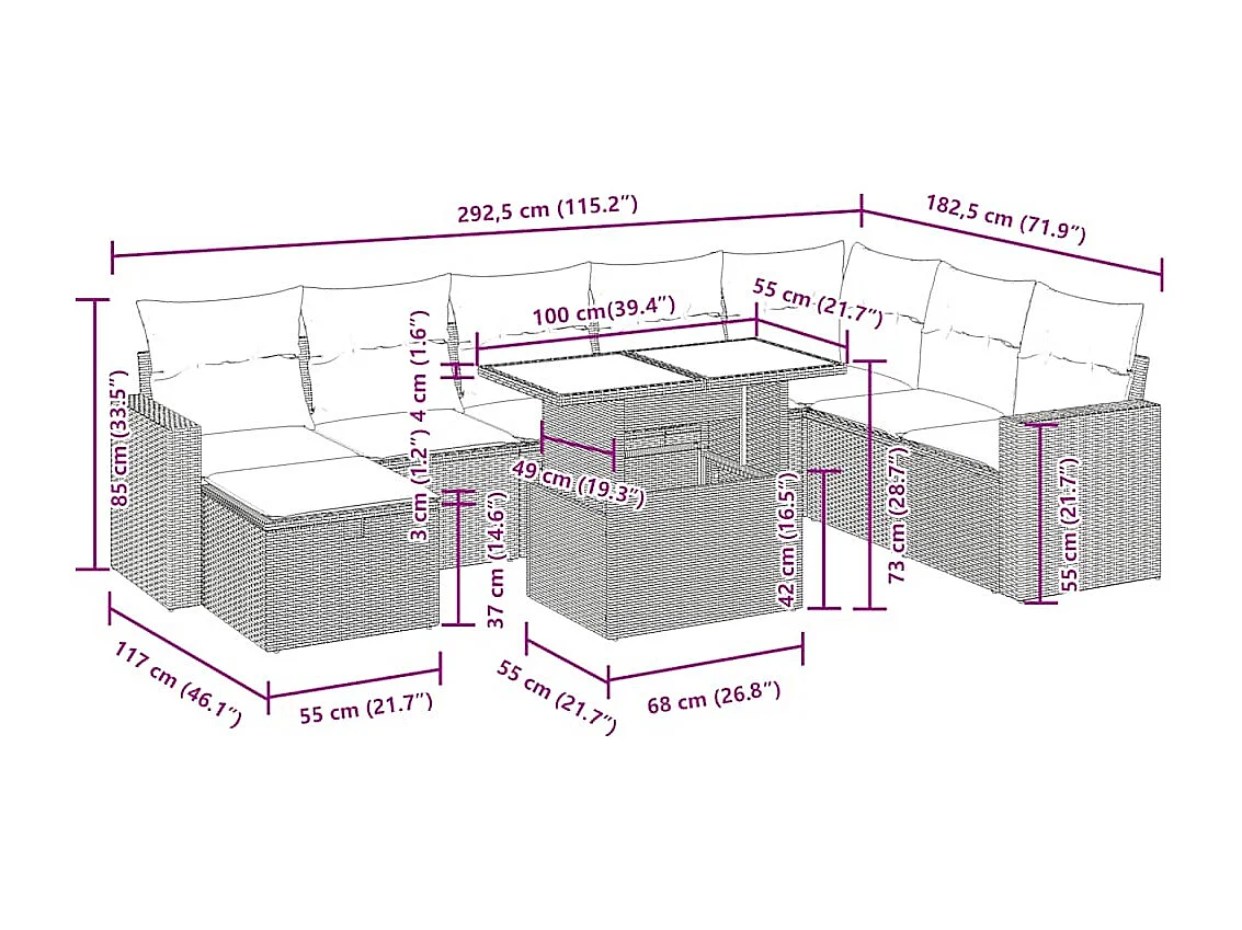 9-delige Loungeset met kussens poly rattan lichtgrijs