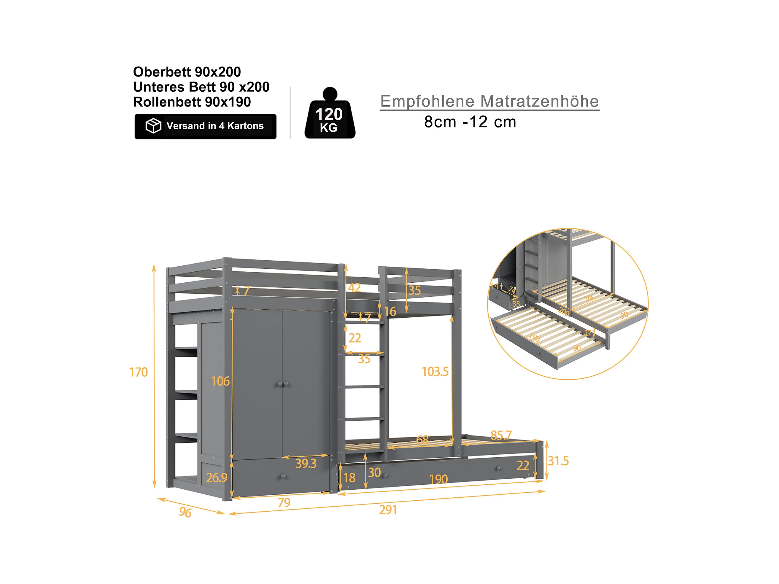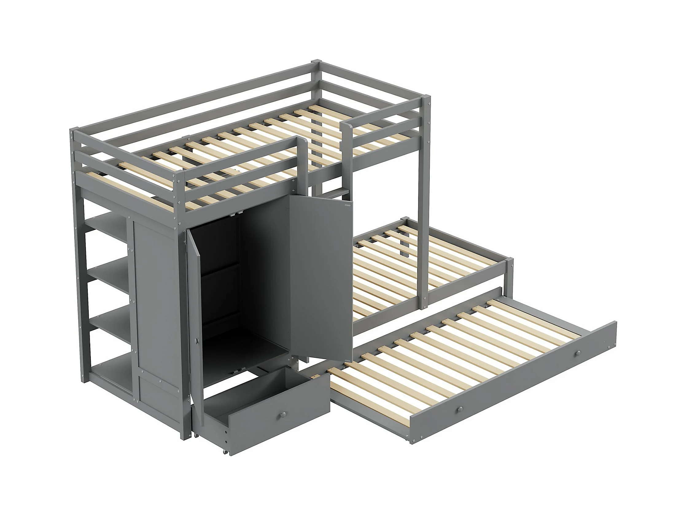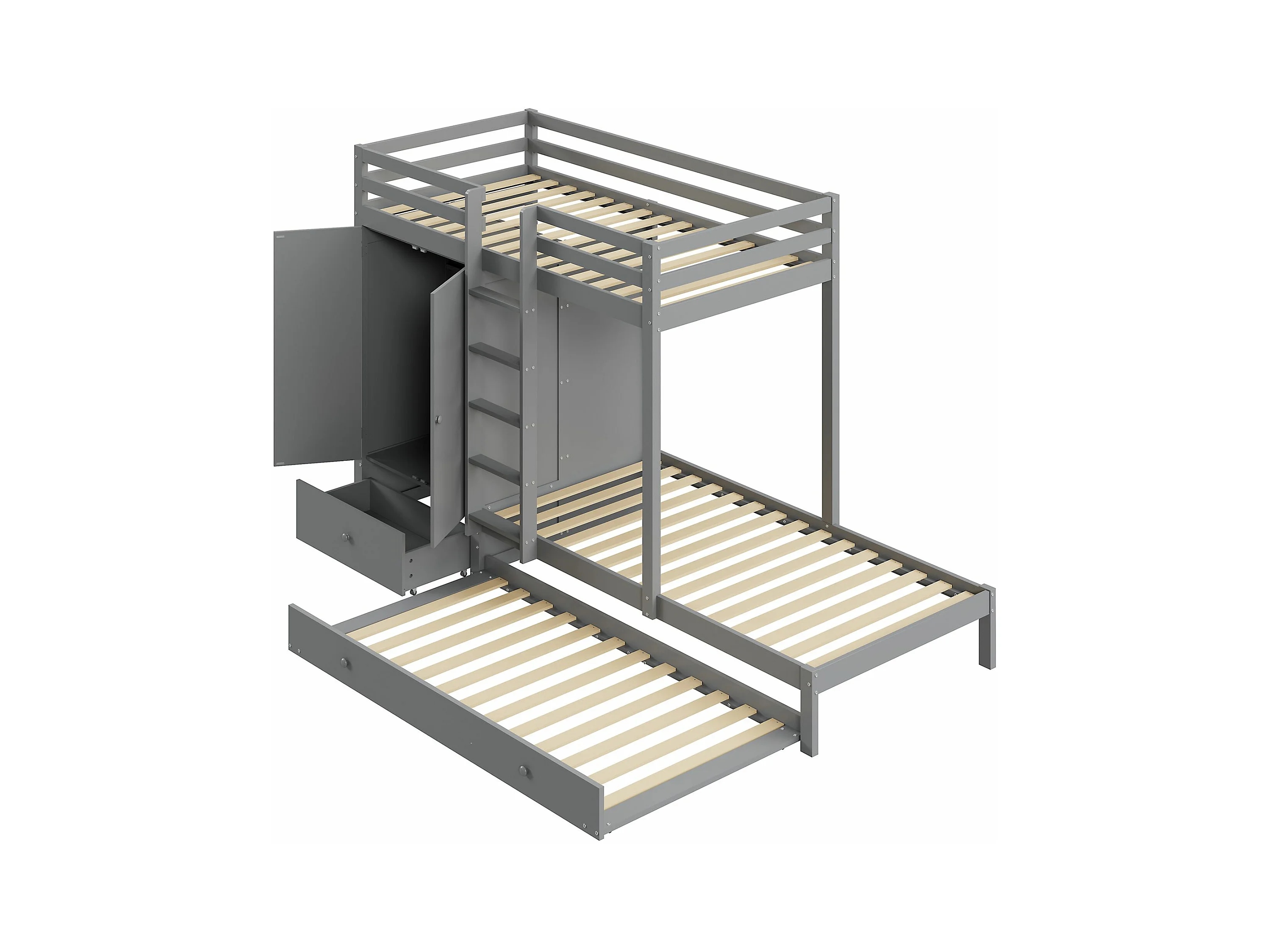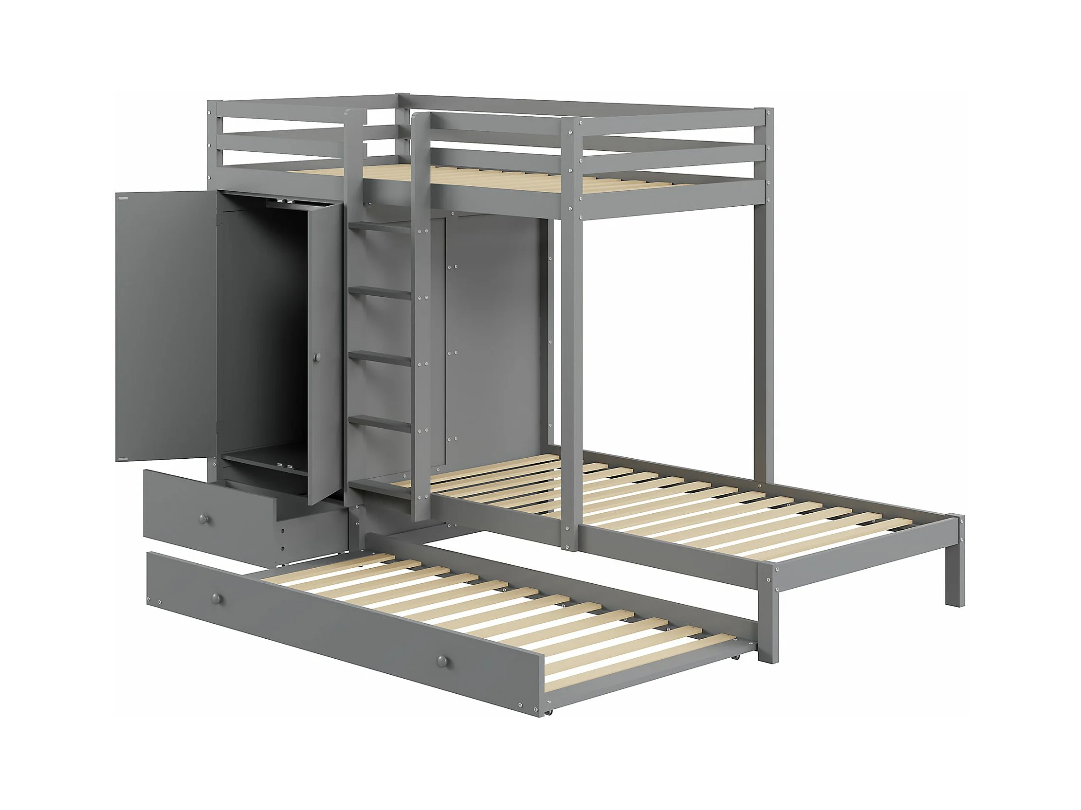 Stapelbed 90x200cm - functioneel kinderbed met 2 opbergladen omvormbaar bed voor 2 bedden - grijs