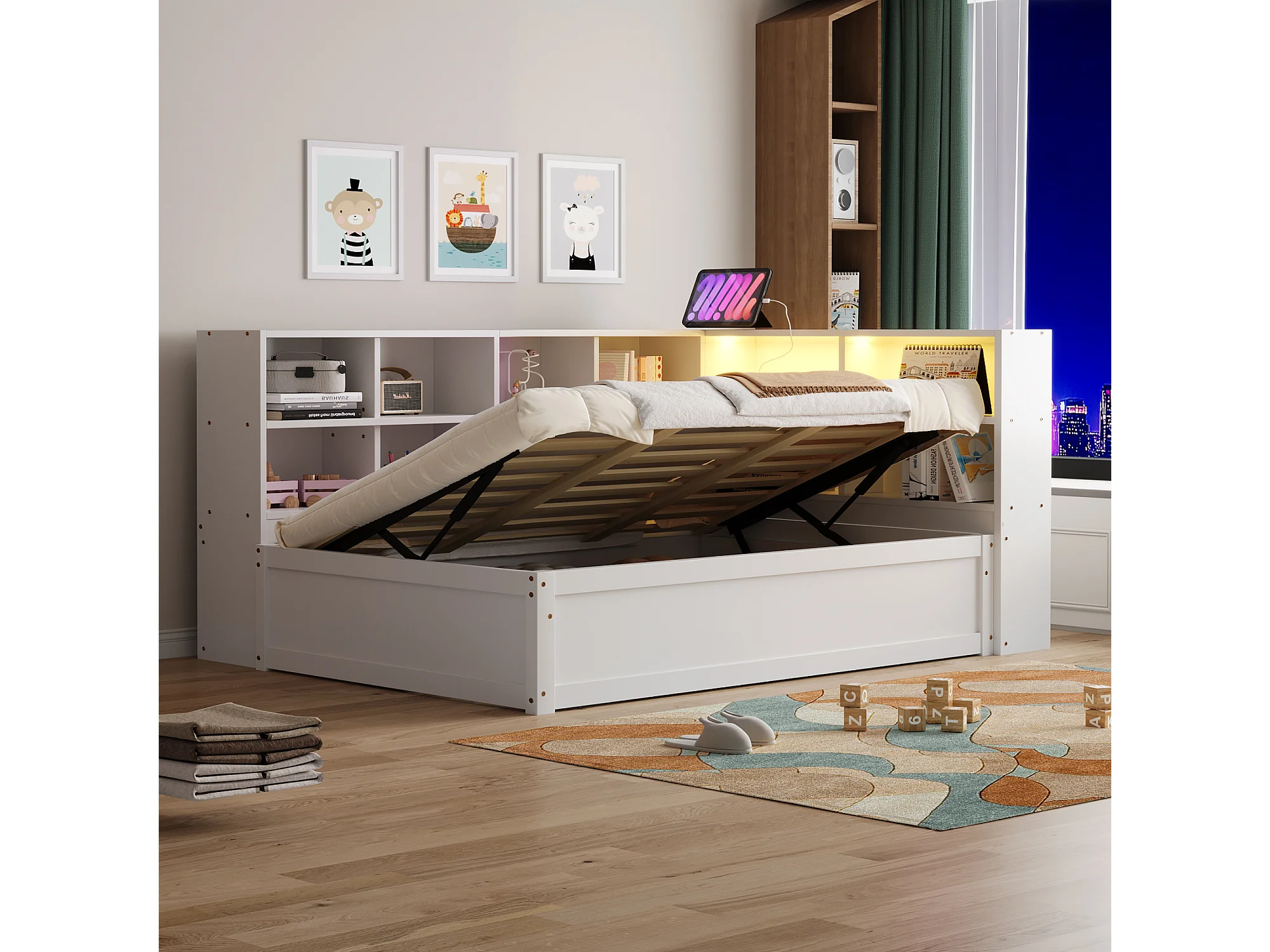Kinderbed 90x200cm, PU lederen kroonframe met LED, lattenbodem en hoofdbord, wit (203x102x122cm)