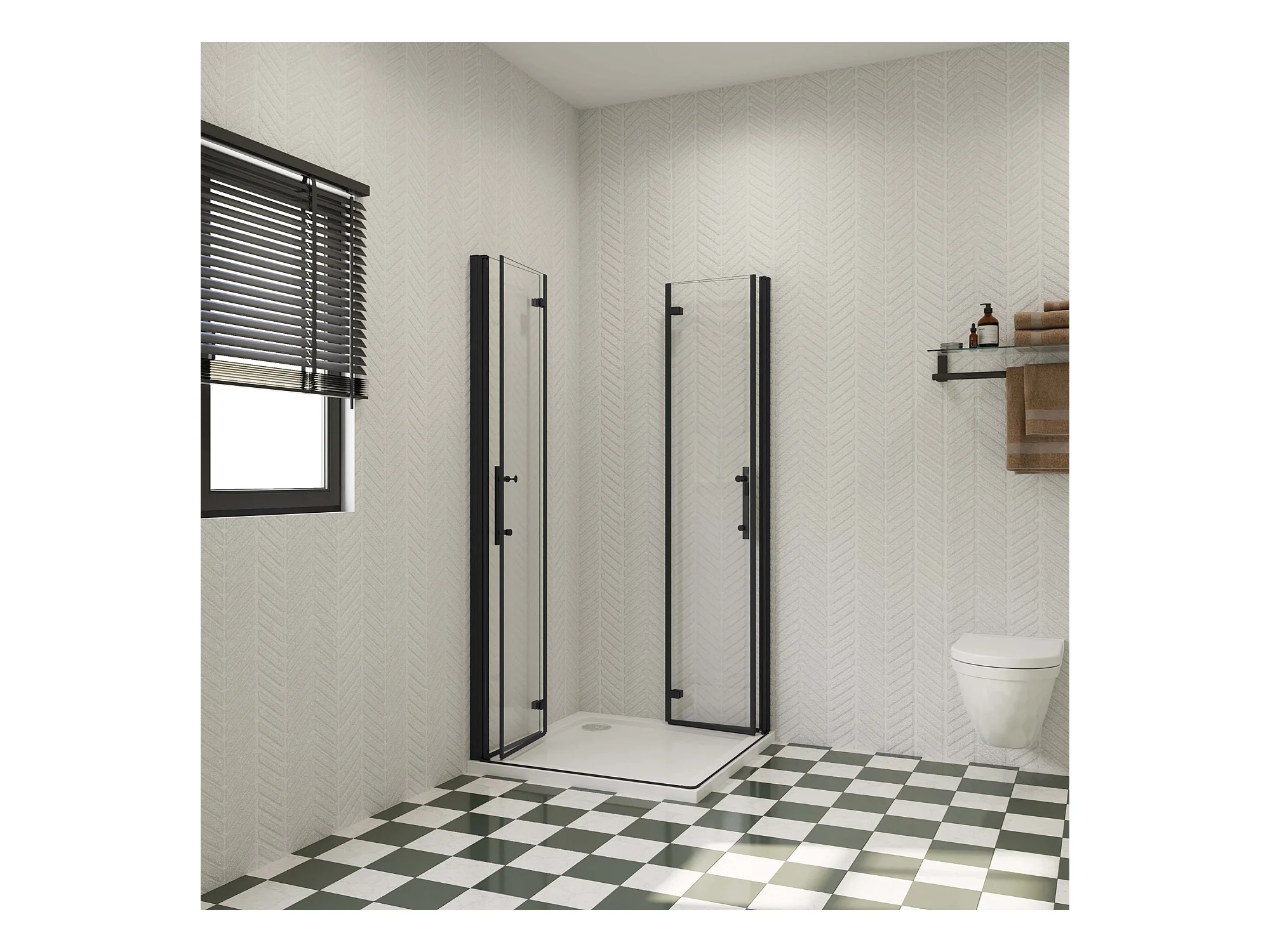 90x70x195cm douchecabine met inklapbare vouwdeur en vaste zijwand, 6mm helder EasyClean veiligheidsglas,mat zwarte aluminium frame, F-vorm 90cm Stabilisatiestang