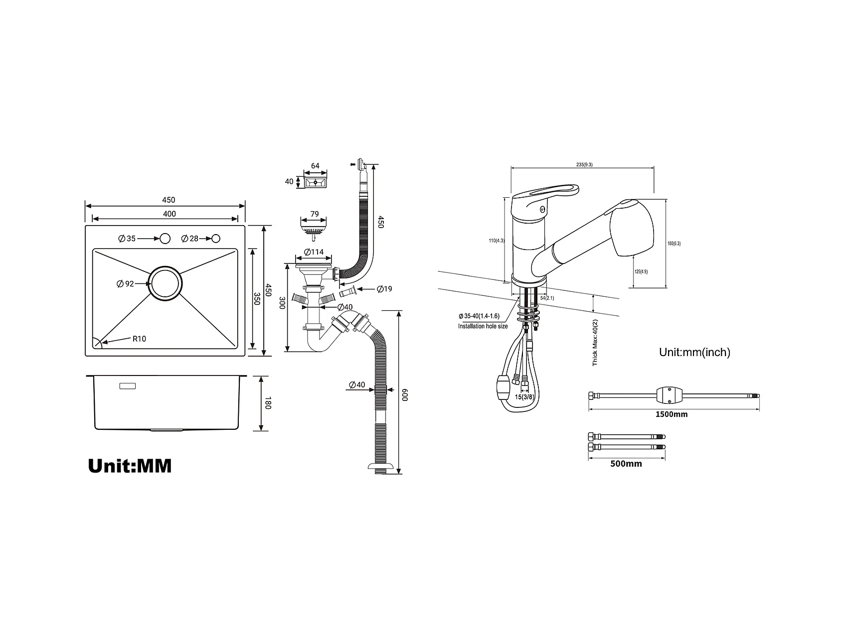 Aanrecht 1 bak 45x45CM 304 roestvrij staal, inbouw en op te zetten + intrekbare keukenkraan met twee functies, zwart, EU model