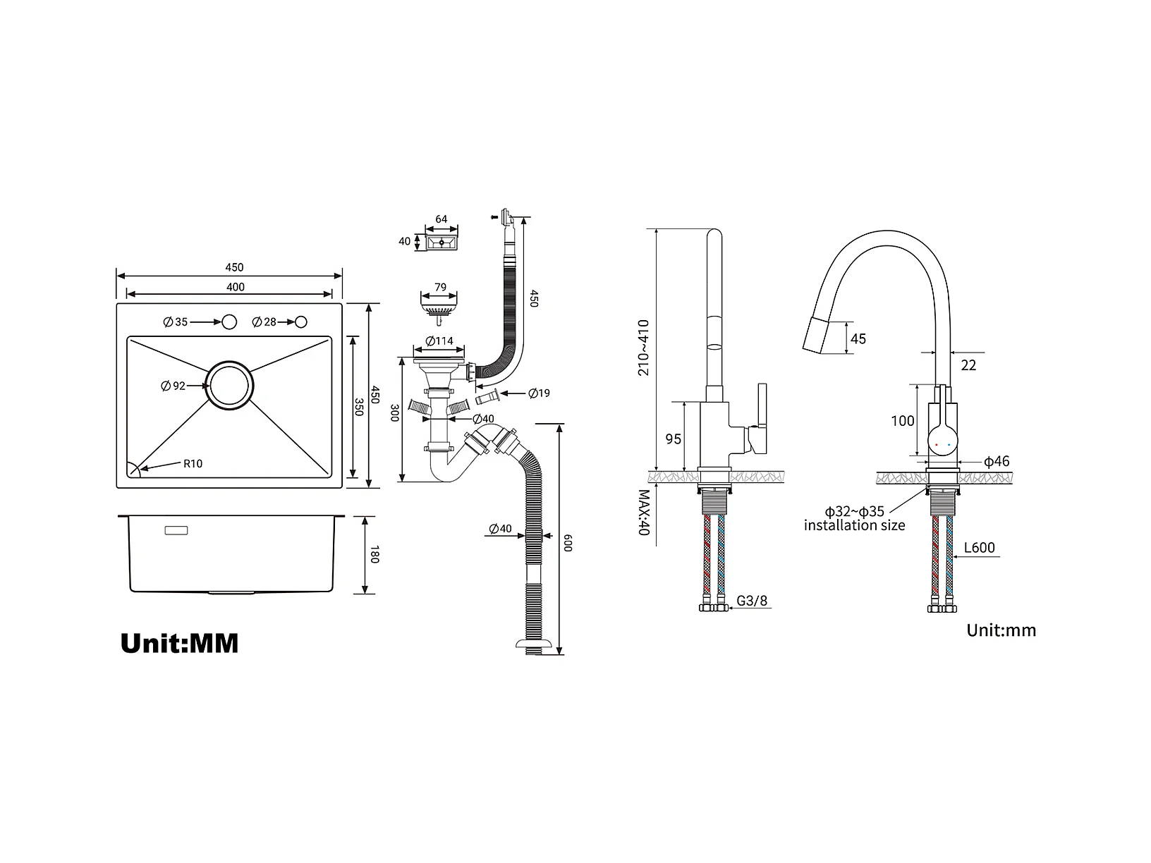 Aanrecht 1 bak 45x45CM RVS 304 , inbouw en op te zetten + keukenmengkraan met 360° draaibare uittrekbare handdouche ,chroom