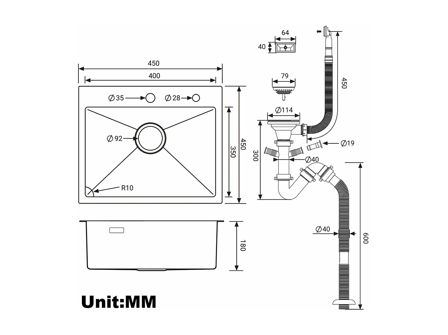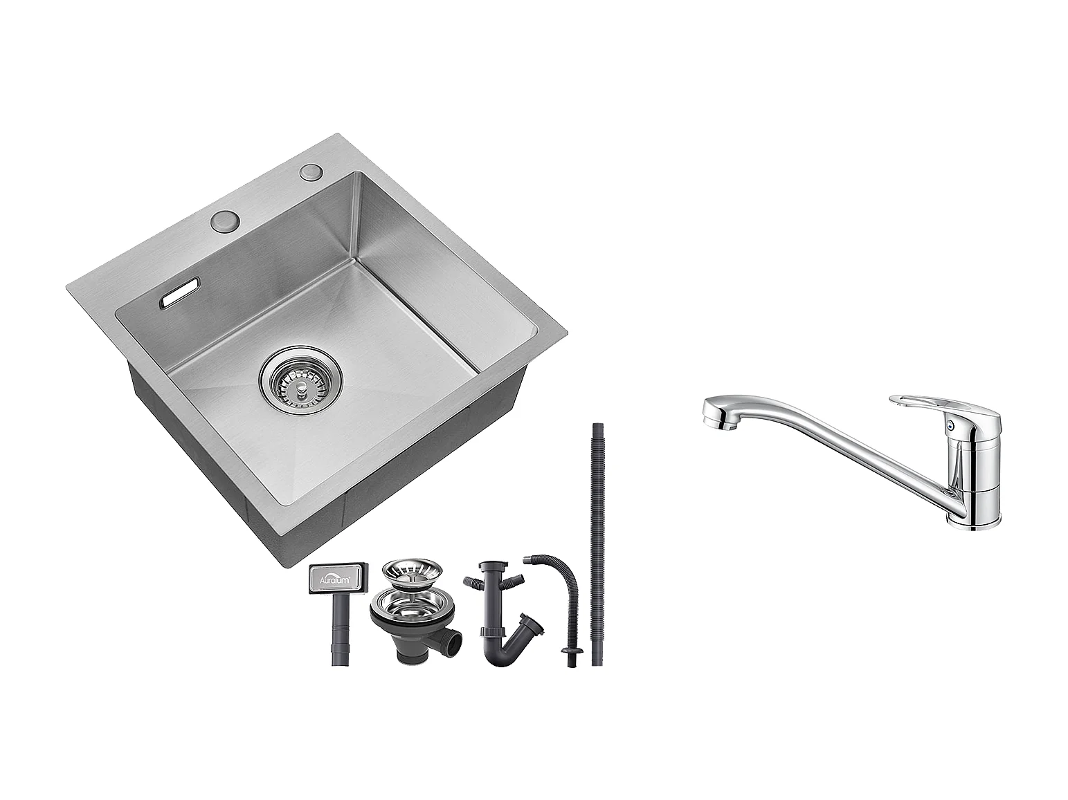 AURALUM MAX Aanrecht 1 Bak 45x45CM, RVS Gootsteen 1 Kom met Sifon en Overloop, Inbouw en Opbouw Wastafel met Montagegat voor Kraan