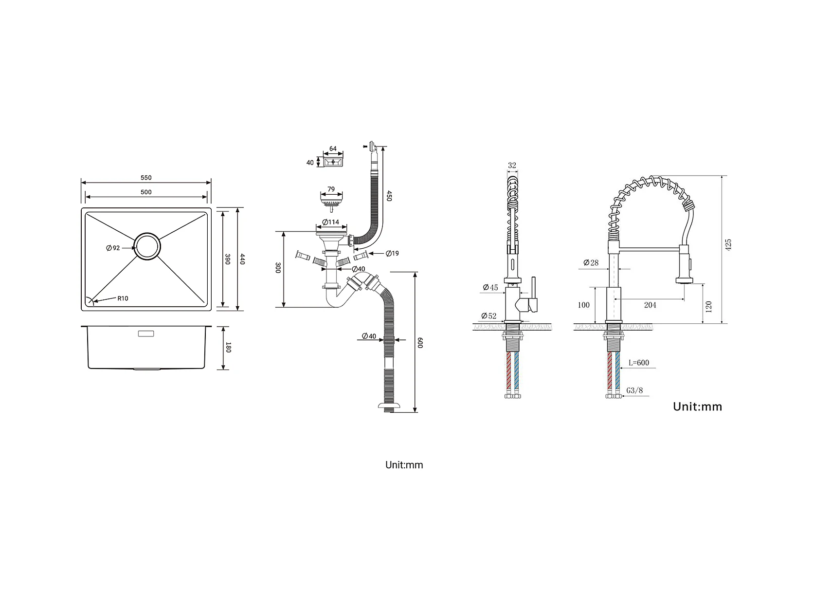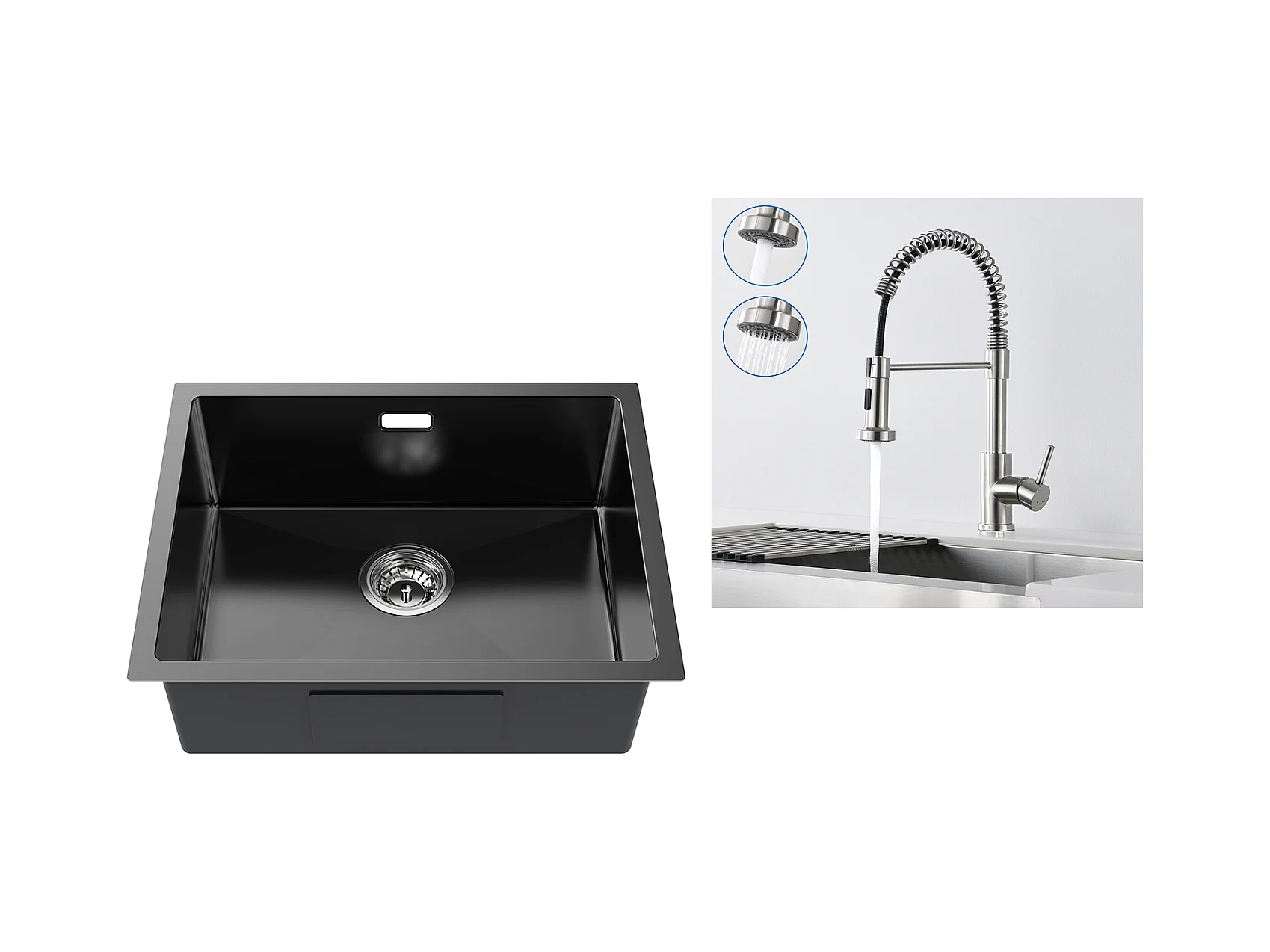 2 in1 Aanrecht 1 Bak 55*44*19CM, Inbouw/Bloei/Ondergrond, Zwart + 360 ° Draaibare Uittrekbare RVS Keukenkraan