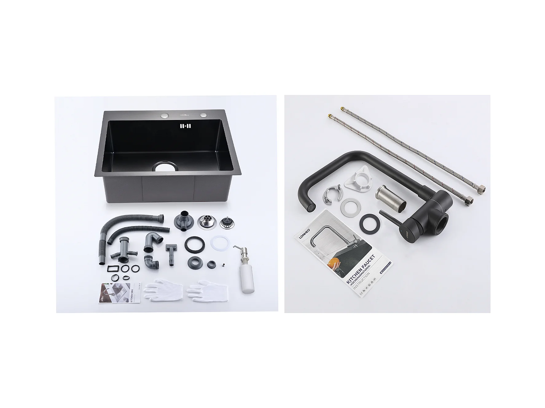 Aanrecht 1 Bak 55*45CM Zwart+Flexibele Keukenkraan Hoge Uitloop Draaibaar