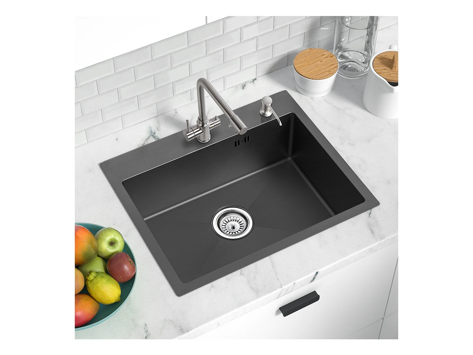 KootsteenNe 1 Bak 55*45CM Zwart+ Keukenmengkraan Roestvrij Staal, Opklapbaar 360° Draaibaar met Vouwgreep Tegen Raam