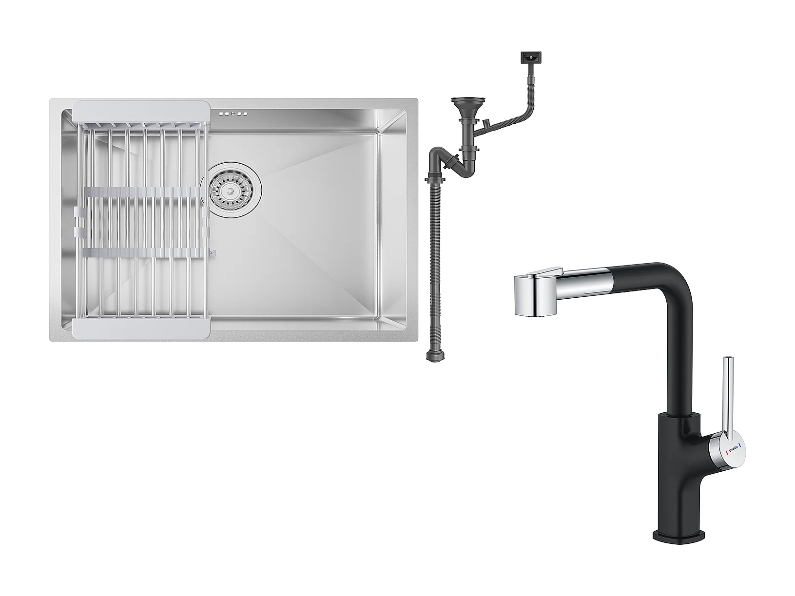 Aanrecht 1 bak 60*44*20CM,304 roestvrij staal,inbouw/ondergrond met afvoermand,Nano+Zwarte keukenkraan met uittrekbare handdouche,2 stralen