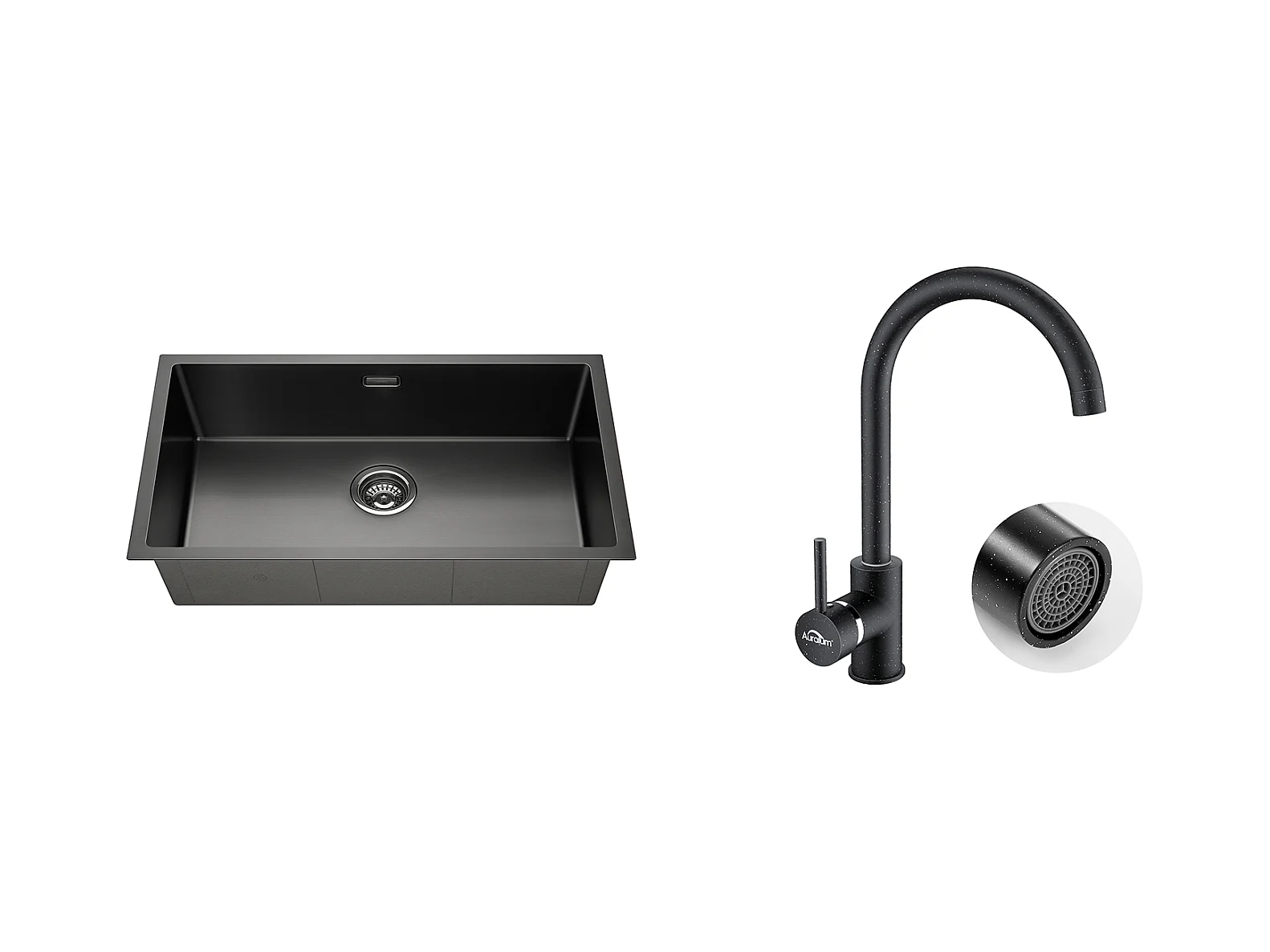 Aanrecht 1 bak 74*44*20CM, in geborsteld roestvrij staal met sifon en overloop + zwarte keukenkraan met uittrekbare handdouche