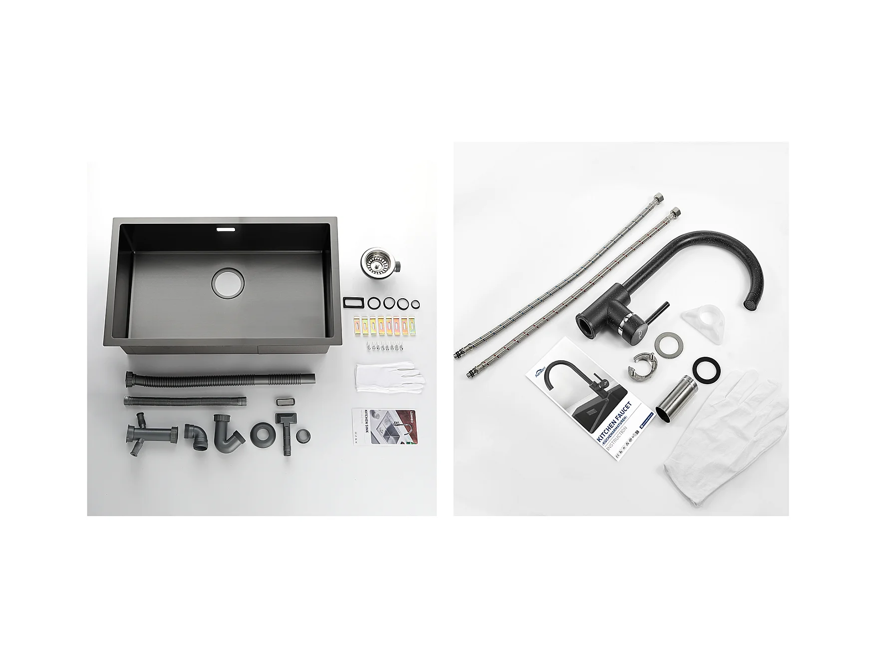Aanrecht 1 bak 74*44*20CM, in geborsteld roestvrij staal met sifon en over-pleinn + flexibele keukenkraan met hoge, richtbare uitloop