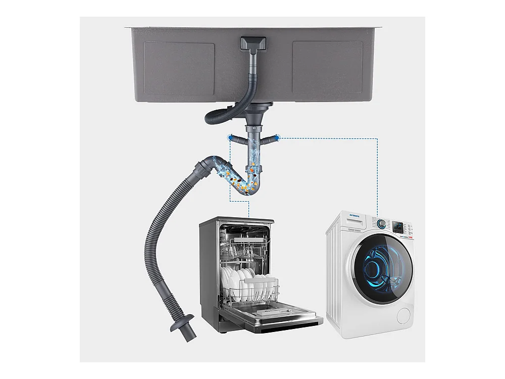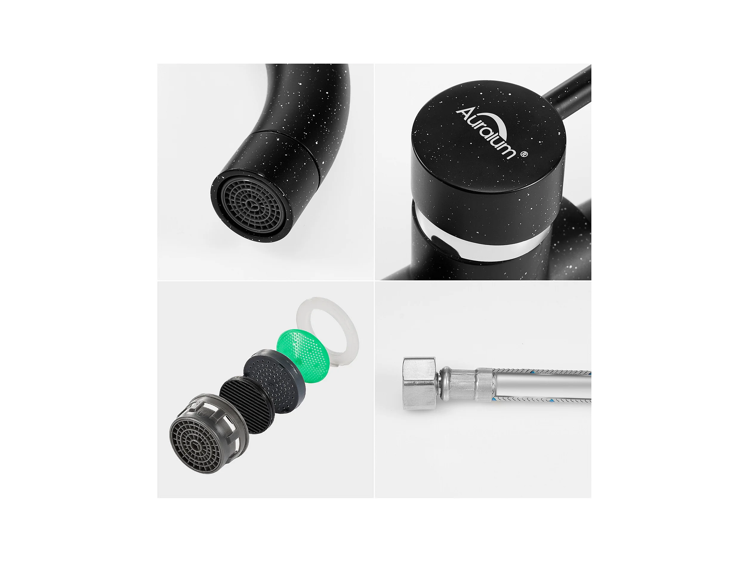 Aanrecht 1 bak 74*44*20CM, in geborsteld roestvrij staal met sifon en overloop + 360° roterende keukenkraan Warm koud water zwart met witte stippen