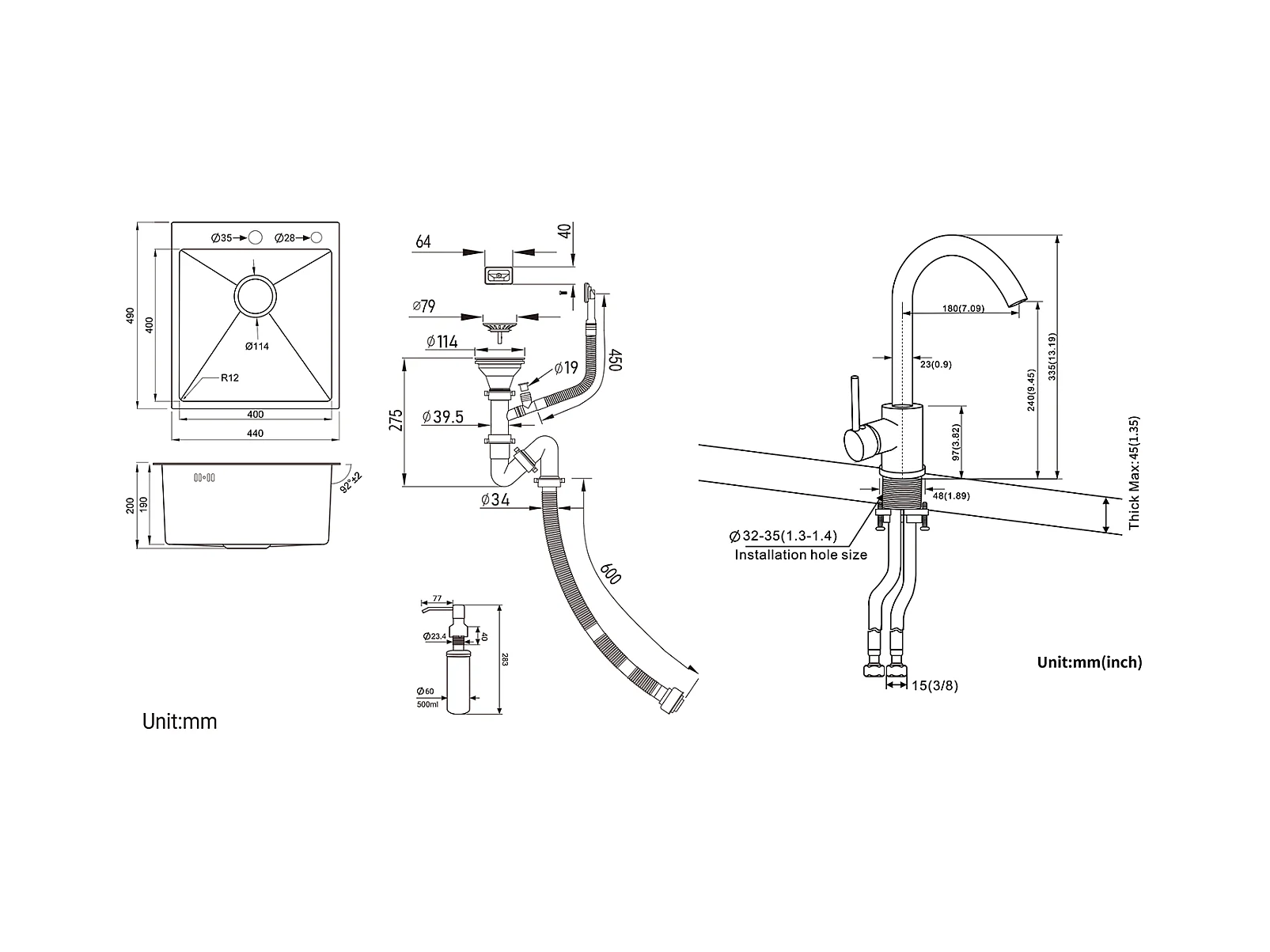 Inbouwspoelbak 44x44x20CMcm RVS Aanrecht 1 Bak, Zwart + Keukenkraan, 360° Richtbaar, Warm/Koud Water, Zwart