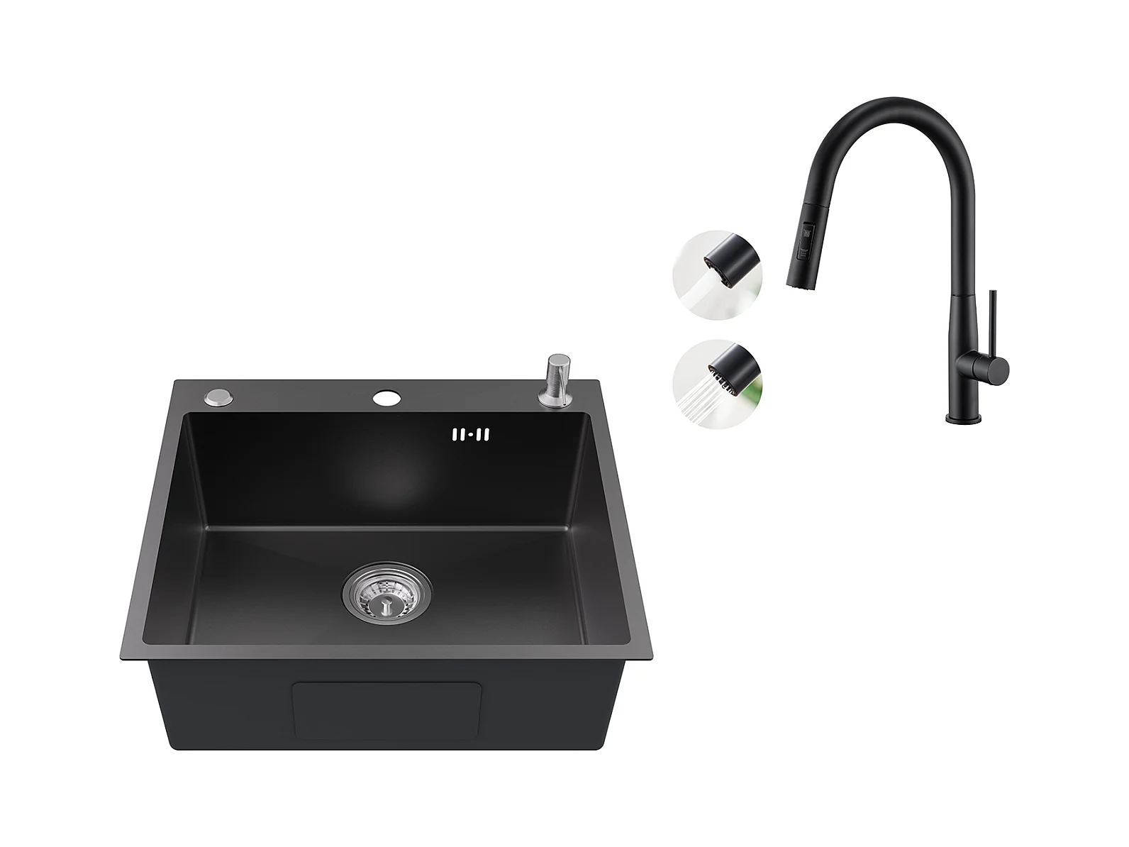 Aanrecht 1 bak 54*49*20 CM, in roestvrij staal, zwart grijs, gootsteen met zeepdispenser + keukenkraan uittrekbare douche twee stralen draaibaar 360°
