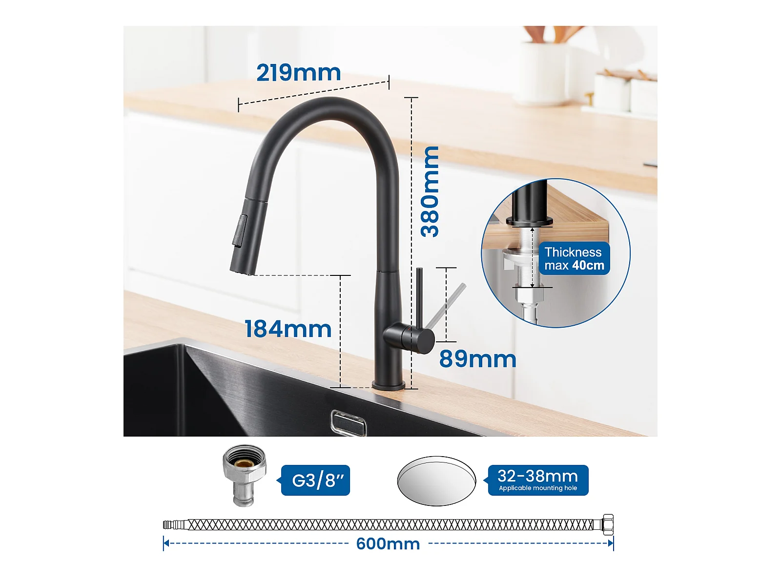 Aanrecht 1Bak 54*49*20 CM,Rvs,Zwart Grijs,Spoelbak met Zeepdispenser+RobiNet Keuken met Uittrekbare Douche ,2 Jets Modi ,Zwart