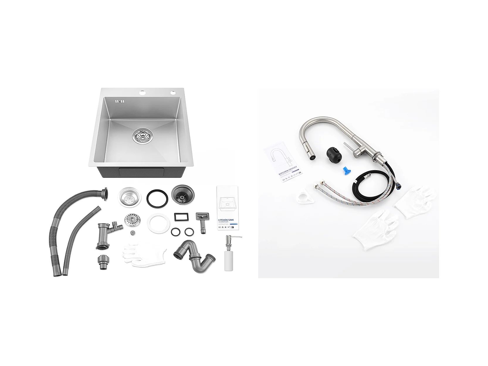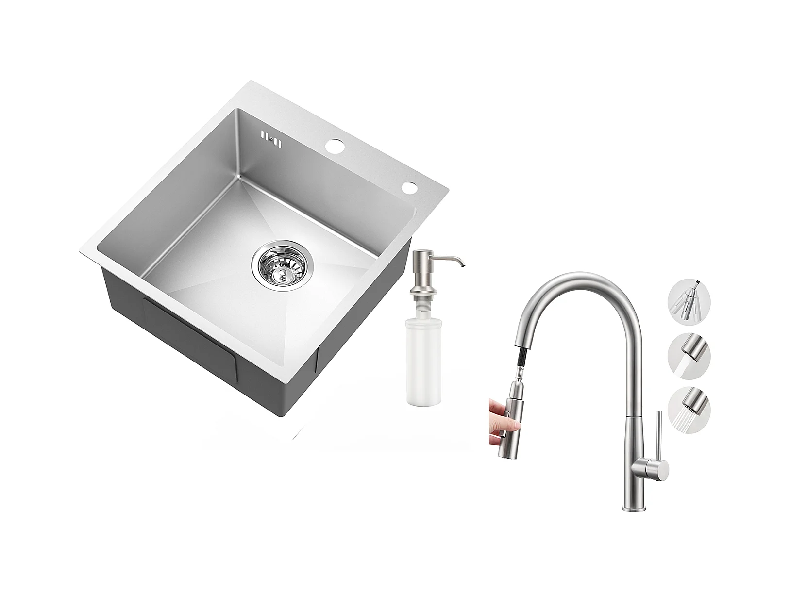 Aanrecht 1Bak Zilver,44*49*20 CM,metZeepdispenser, RVS + 360° Draaibare Keukenkraan Uittrekbare Handdouche