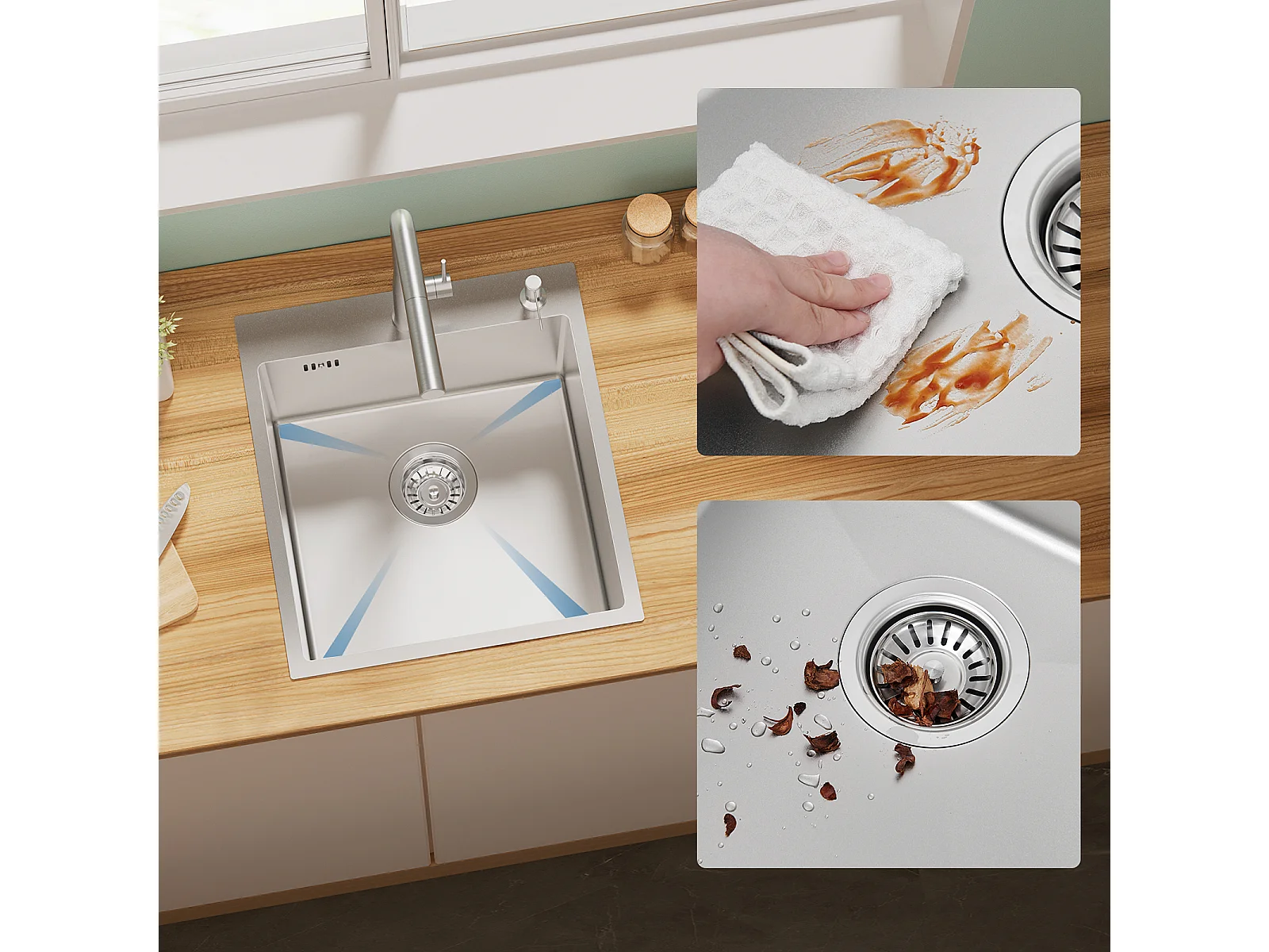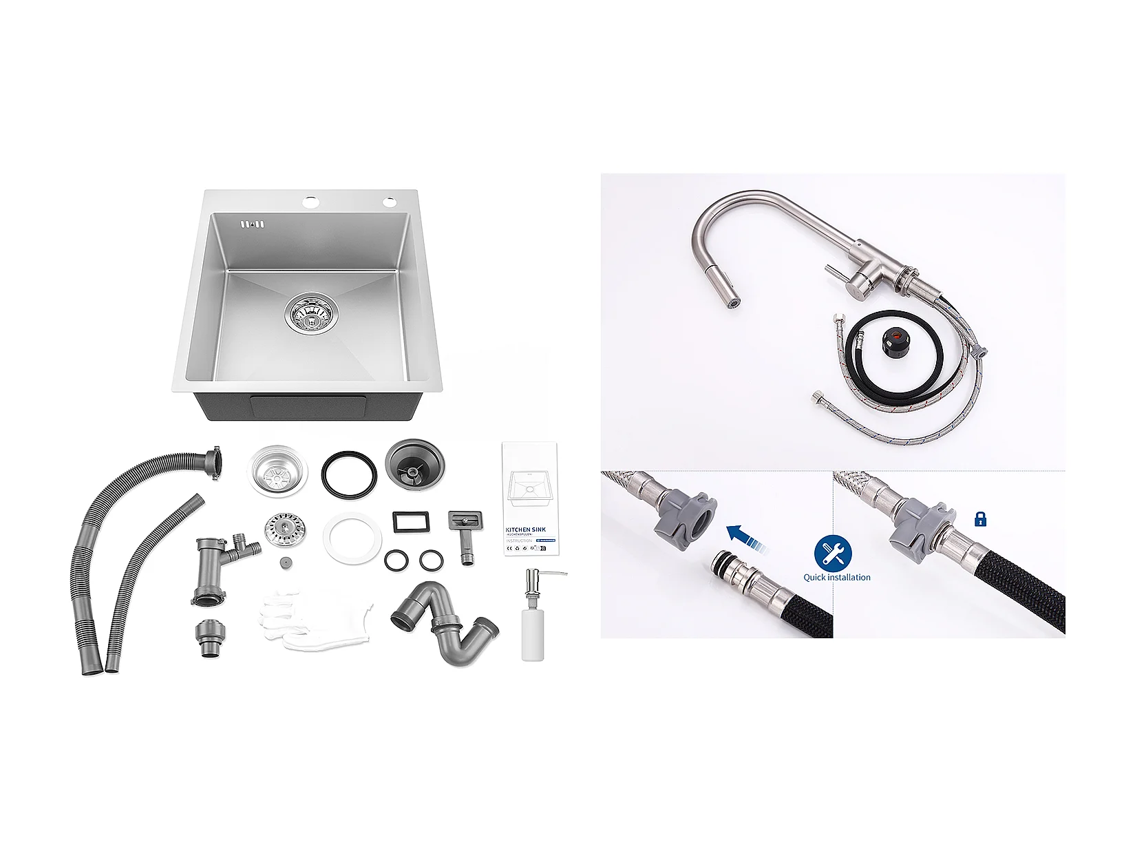 Aanrecht 1Bak Zilver,44*49*20 CM,metZeepdispenser, RVS + 360° Draaibare Keukenkraan Uittrekbare Handdouche