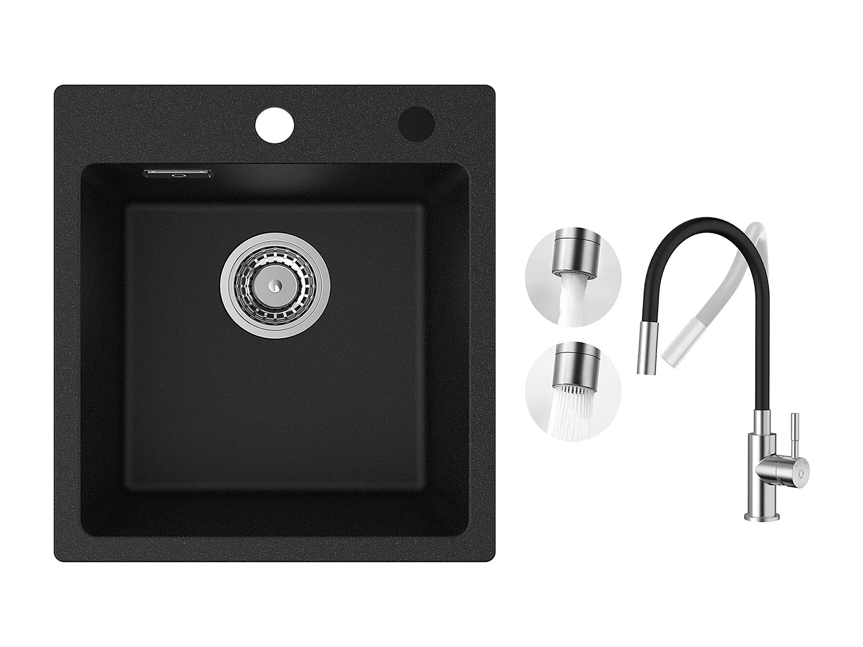 Cecipa max 40x45cm keukenspoelbak in kwarts en hars quartz spoelbak 1 bak zwart + mengkraan met uittrekbare straal met 2 soorten straal zwart