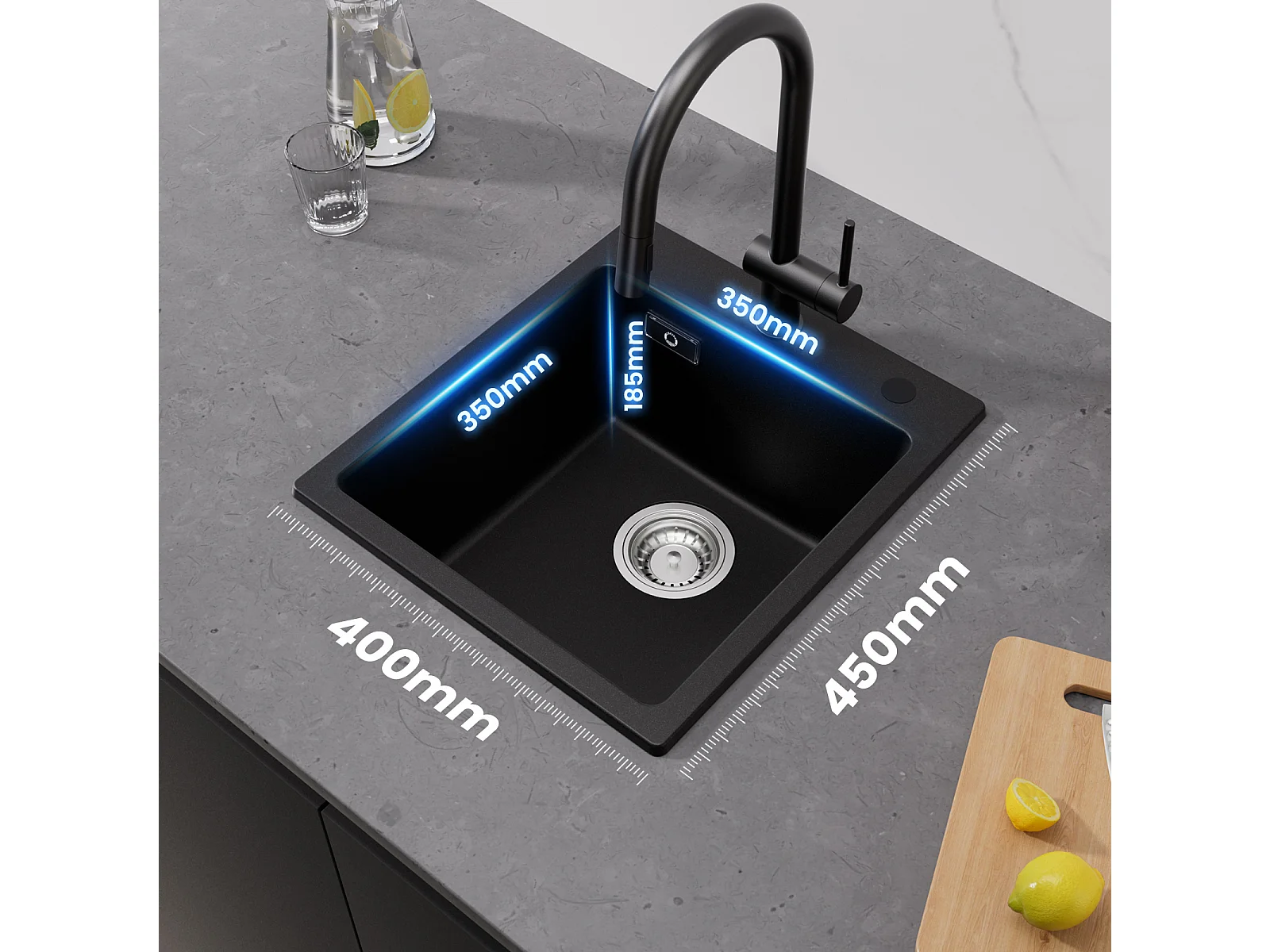 Cecipa MAX 40x45cm zwarte keukenspoelbak in kwarts en hars 1 bak spoelbak + 360° draaibare spoelbakmengkraan geborsteld
