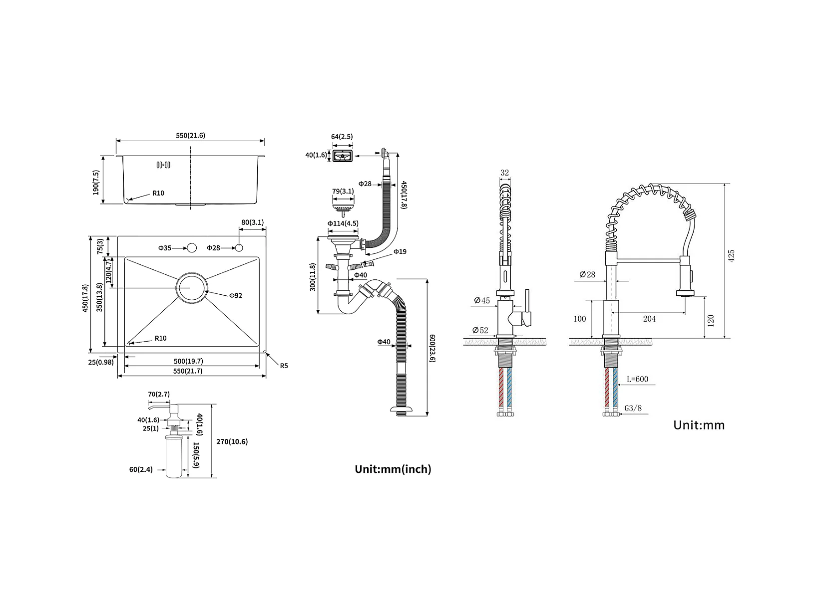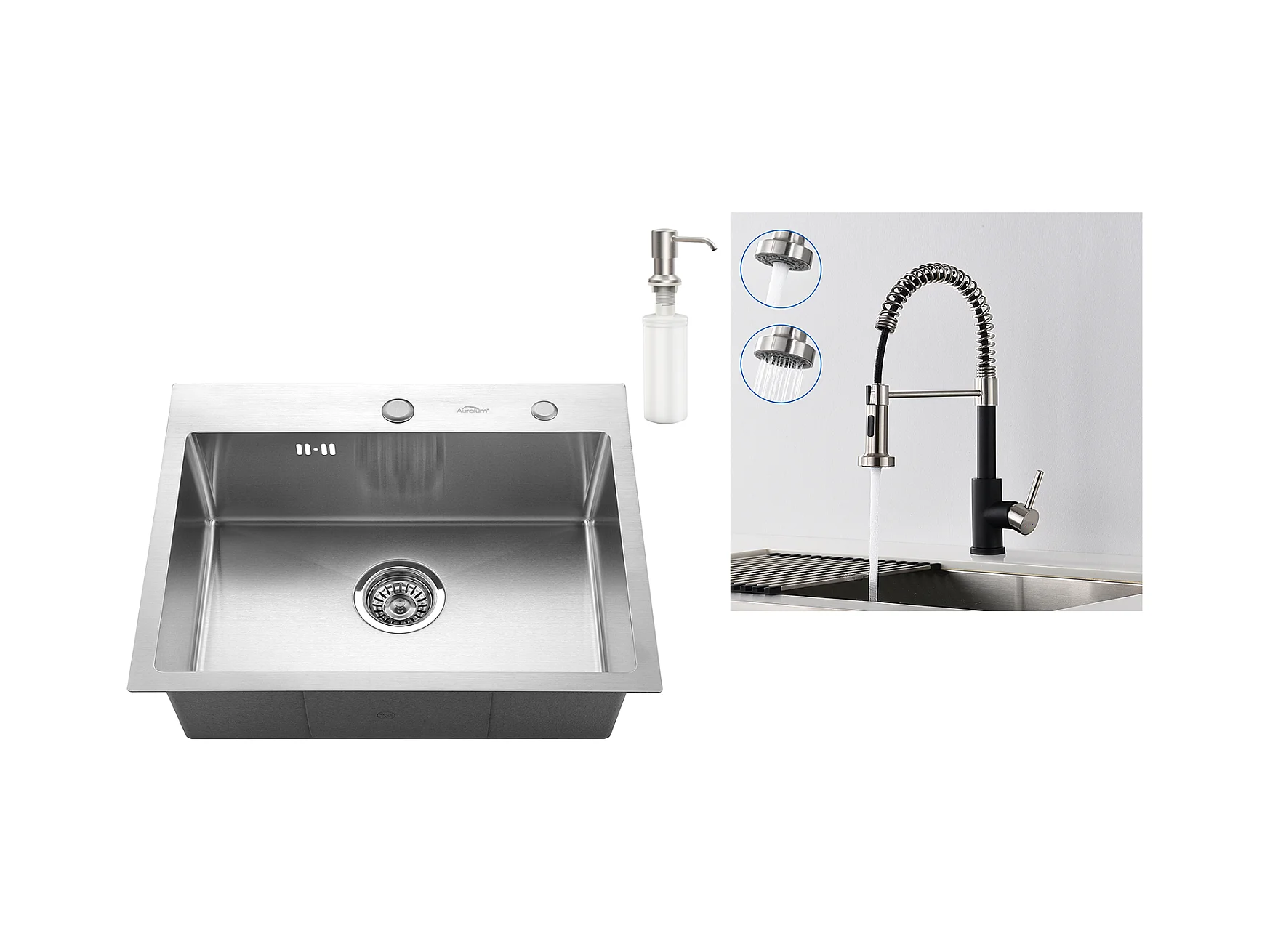 AuraLum Max Aanrecht 1 Bak 55*45CM Inbouw en Opzetbare Spoelbak met Zeepdispenser+Intrekbare Keukenkraan met twee functies,EU Model