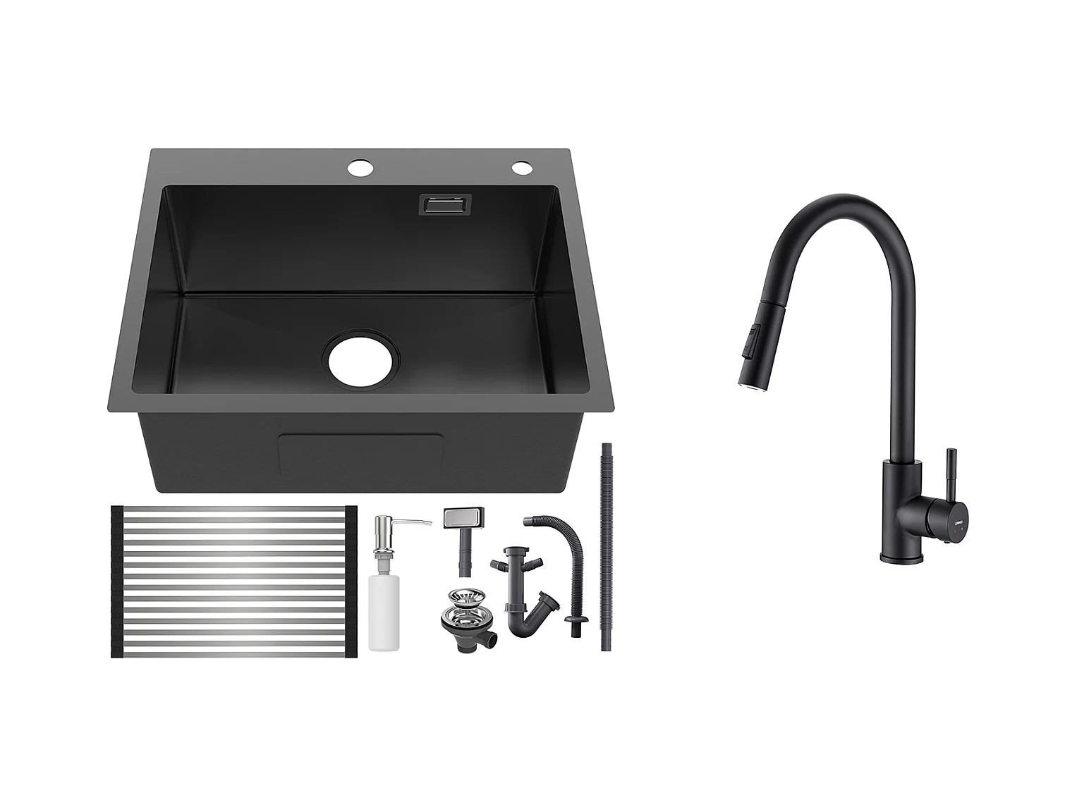 Aanrecht 1Bak 58*45*18CM, met Oprolbare gootsteenafdruiprek/Zeepdispenser+MengkraanKeuken met 360° Draaibare Uittrekbare Douche,Zwart