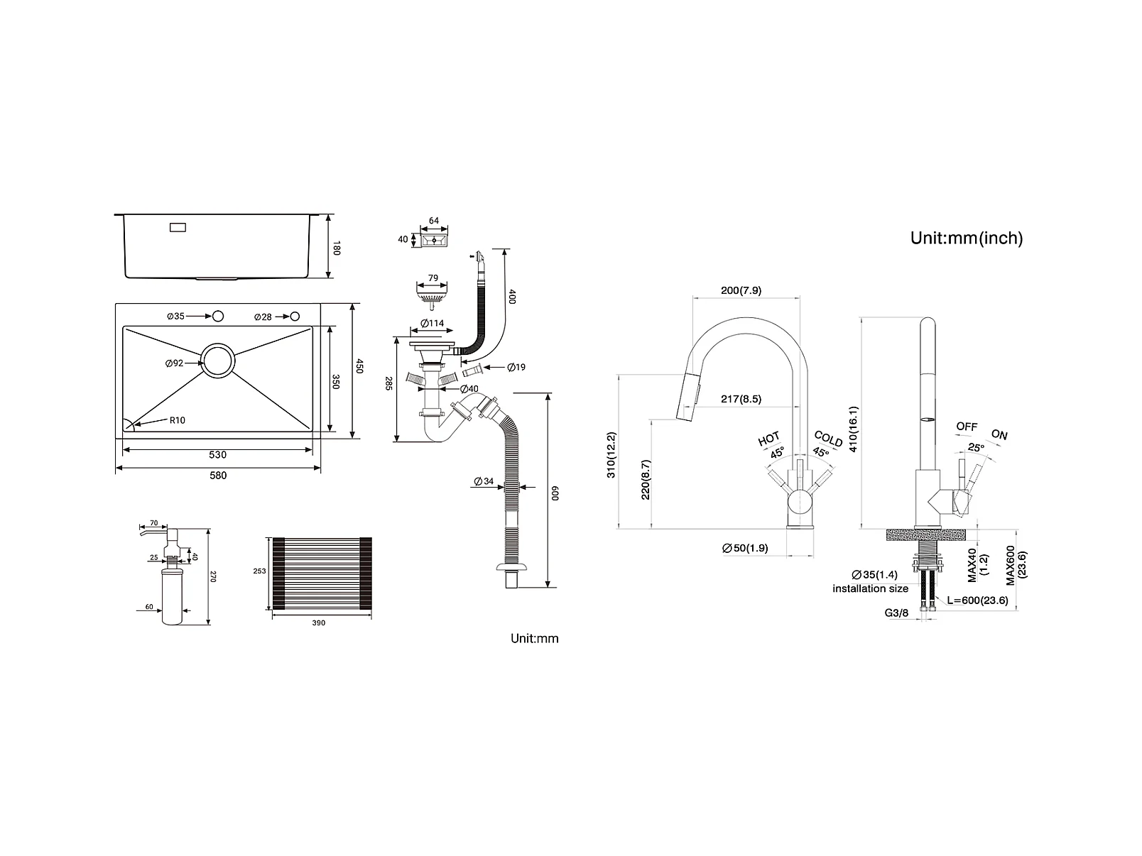 Aanrecht 1bak 58*45*18CM, met oprolbare gootsteenafdruiprek/zeepdispenser+ 360° draaibare keukenmengkraan, demonteerbare spoelbak, zwart