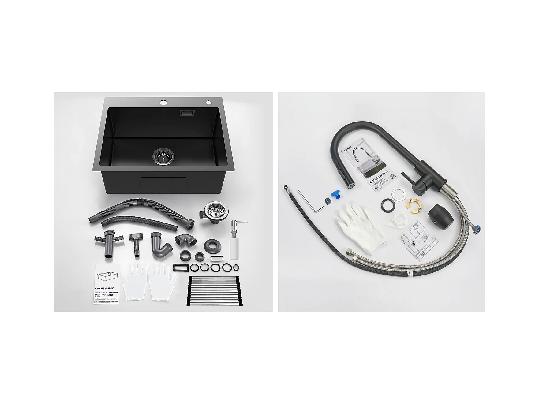 Aanrecht 1bak Zwart 58*45*18CM, met oprolbare gootsteenafdruiprek/zeepdispenser + omklapbare keukenmengkraan 360° draaibaar, zwart