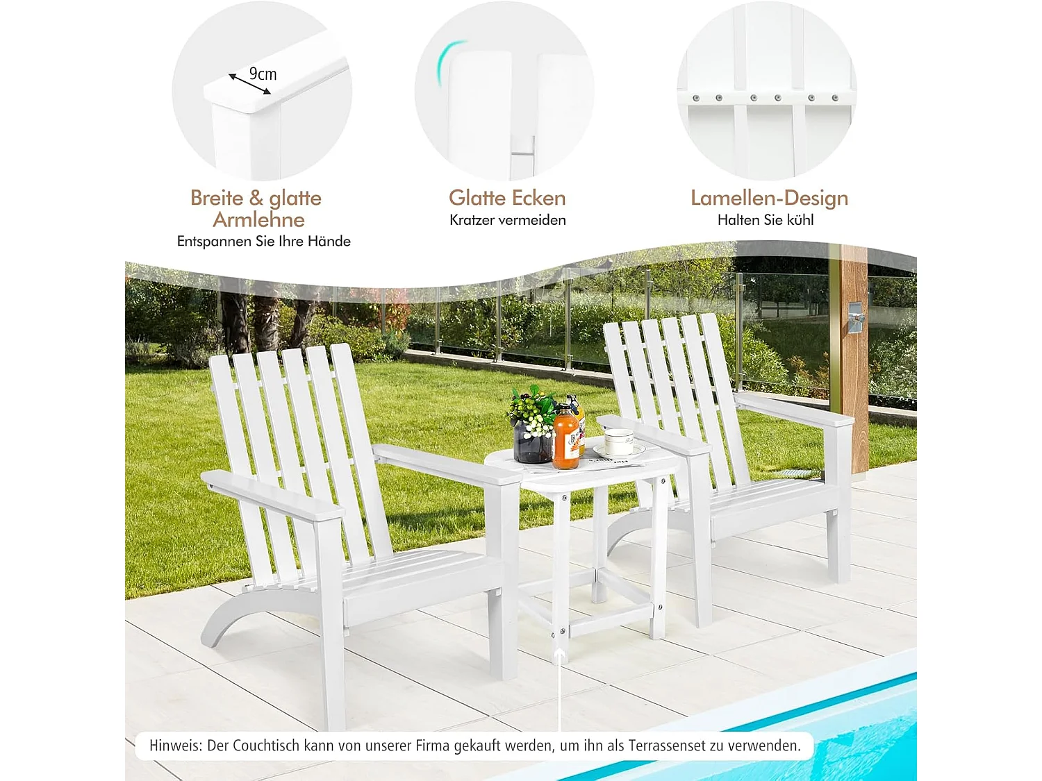 Adirondack tuinstoelen met tafel in wit dennenhout