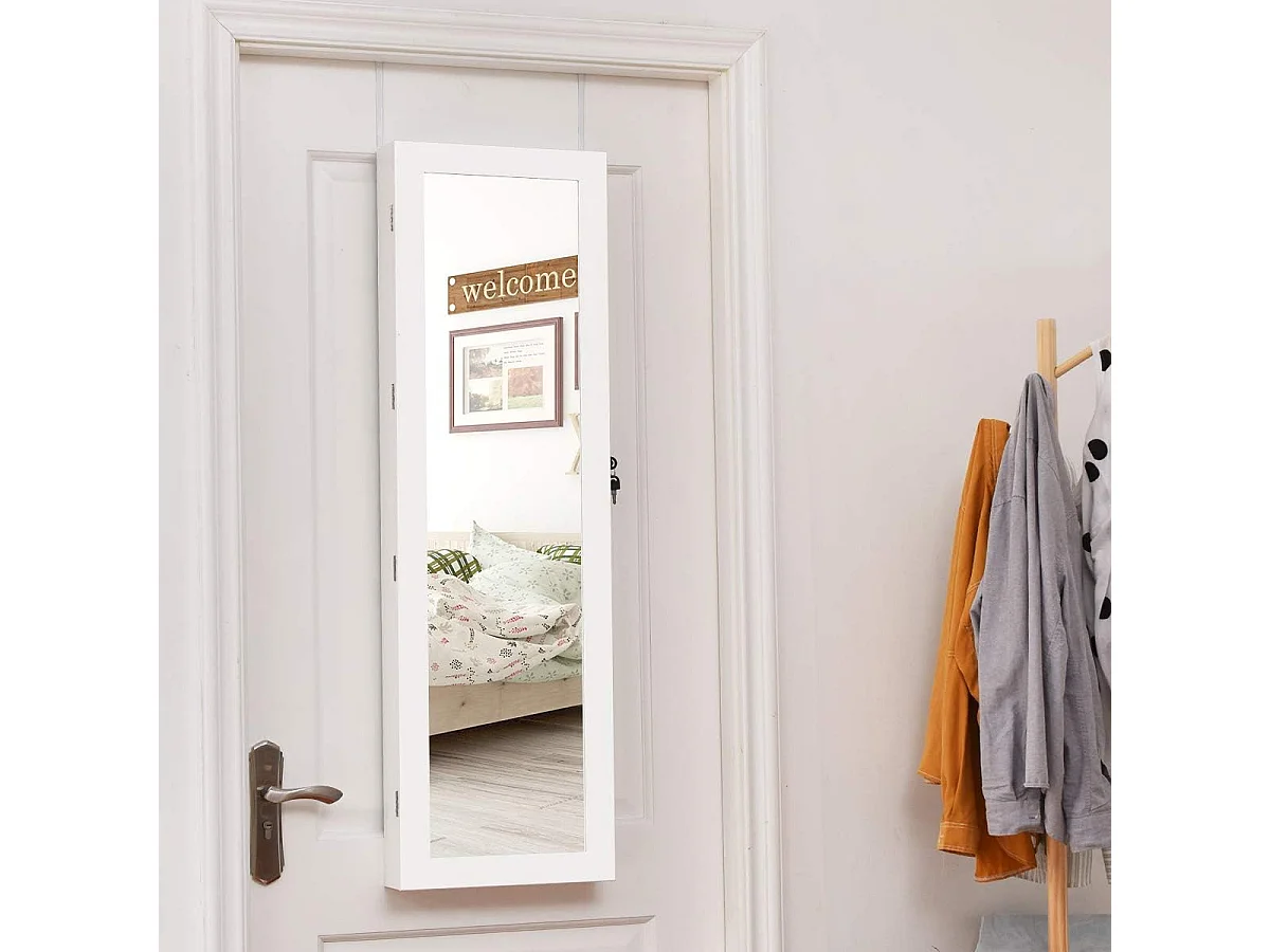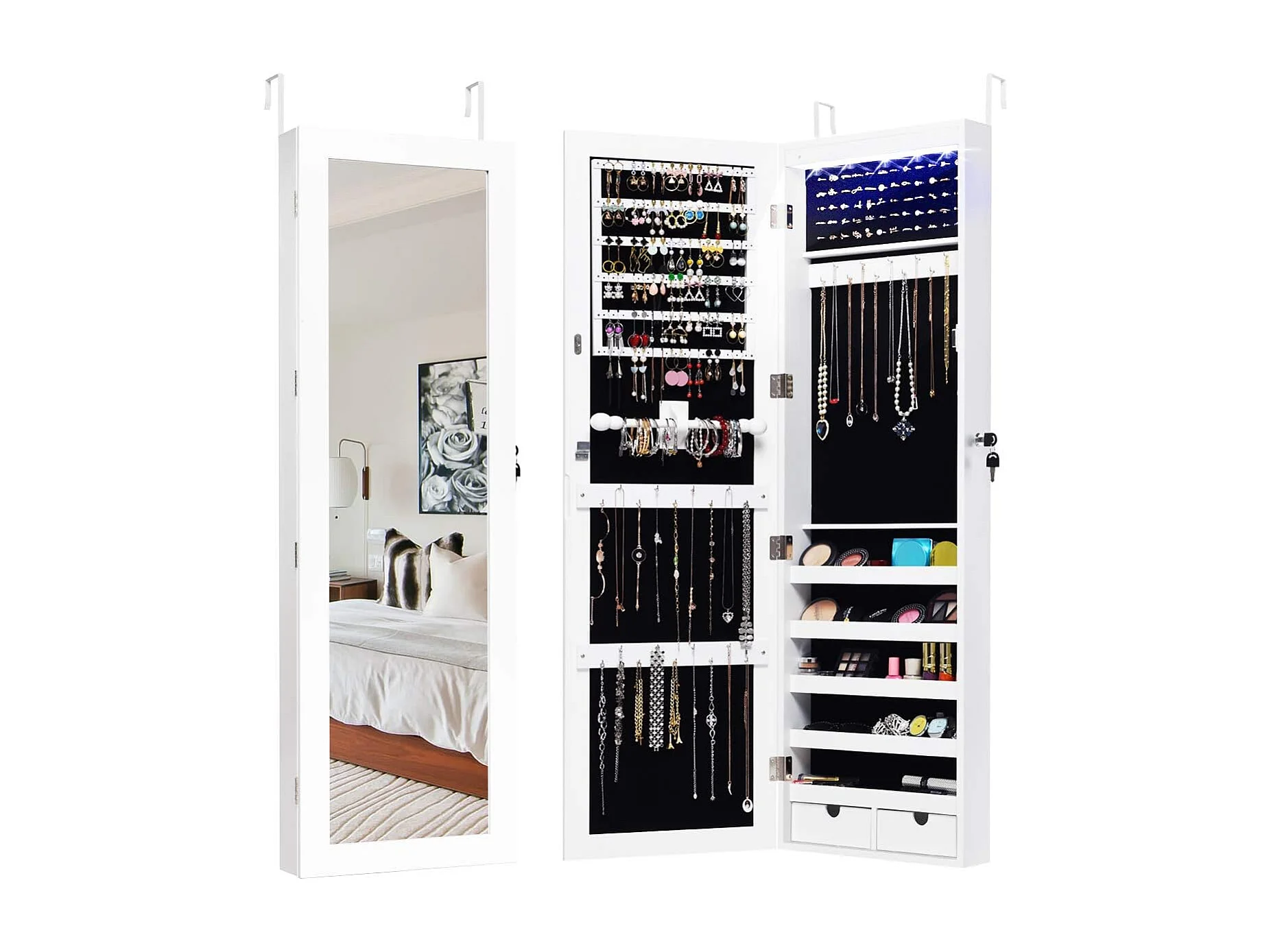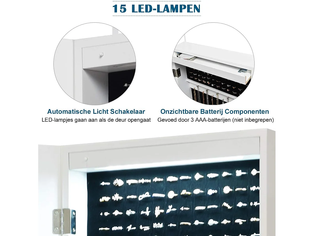 Spiegelende sieradenkast met 6 ledlampen & 2 laden, sieradenhangkast afsluitbaar, silevelkast, wand-/deurmontage (wit)TI89458