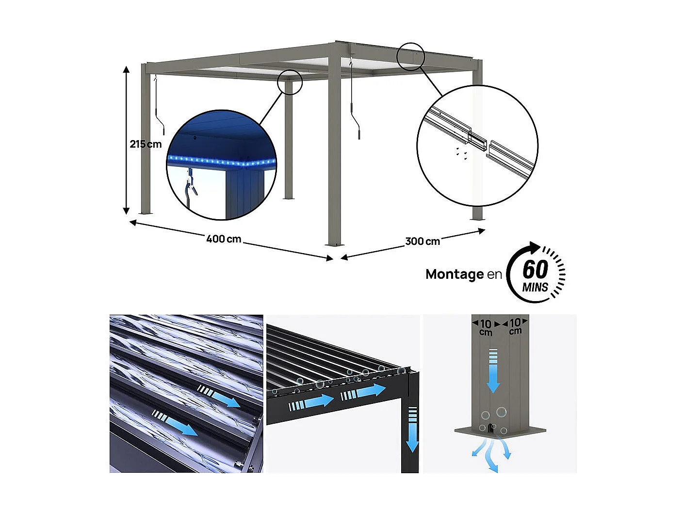 Pergola terrasoverkapping zonwering 3 x 4 m verstelbaar aluminium met led verlichting "Windsor premium" - Taupe - grijs bruin