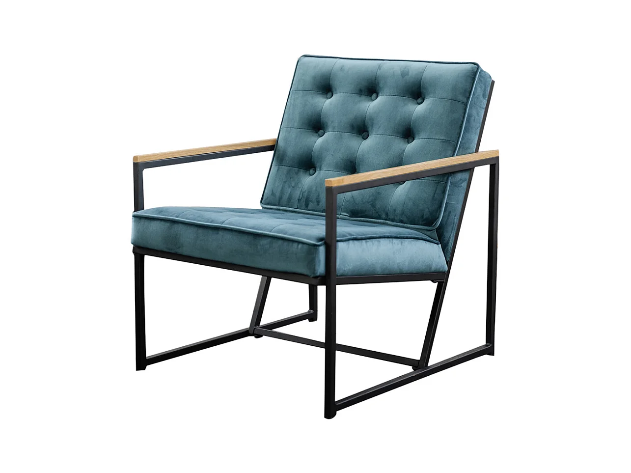 Fluwelen fauteuil in eendenblauw met houten poten, collectie ENJOY. Scandinavische stijl.