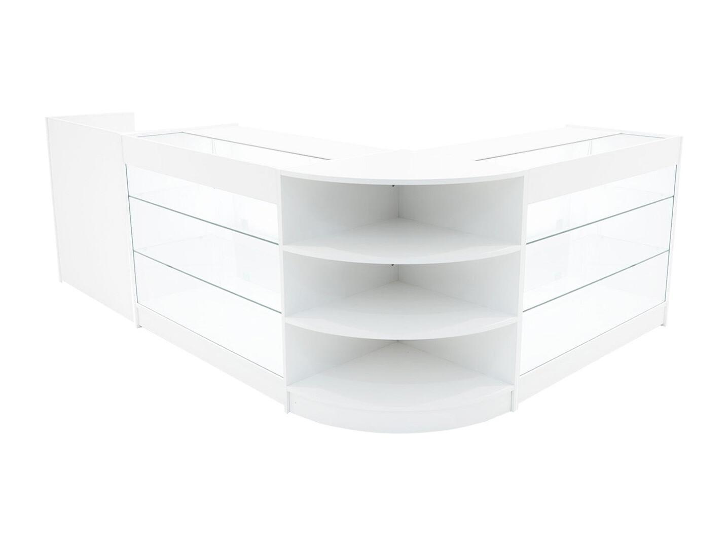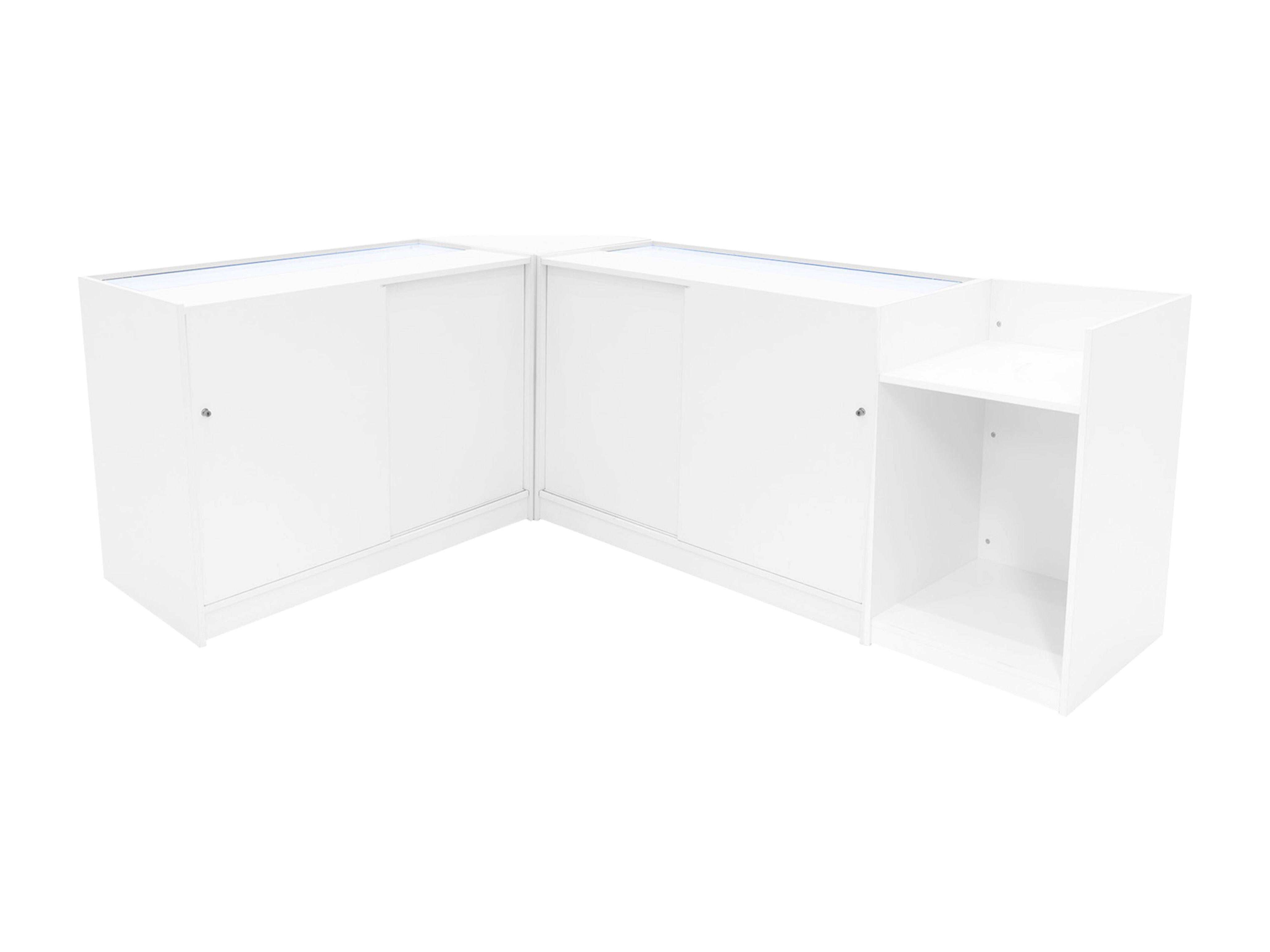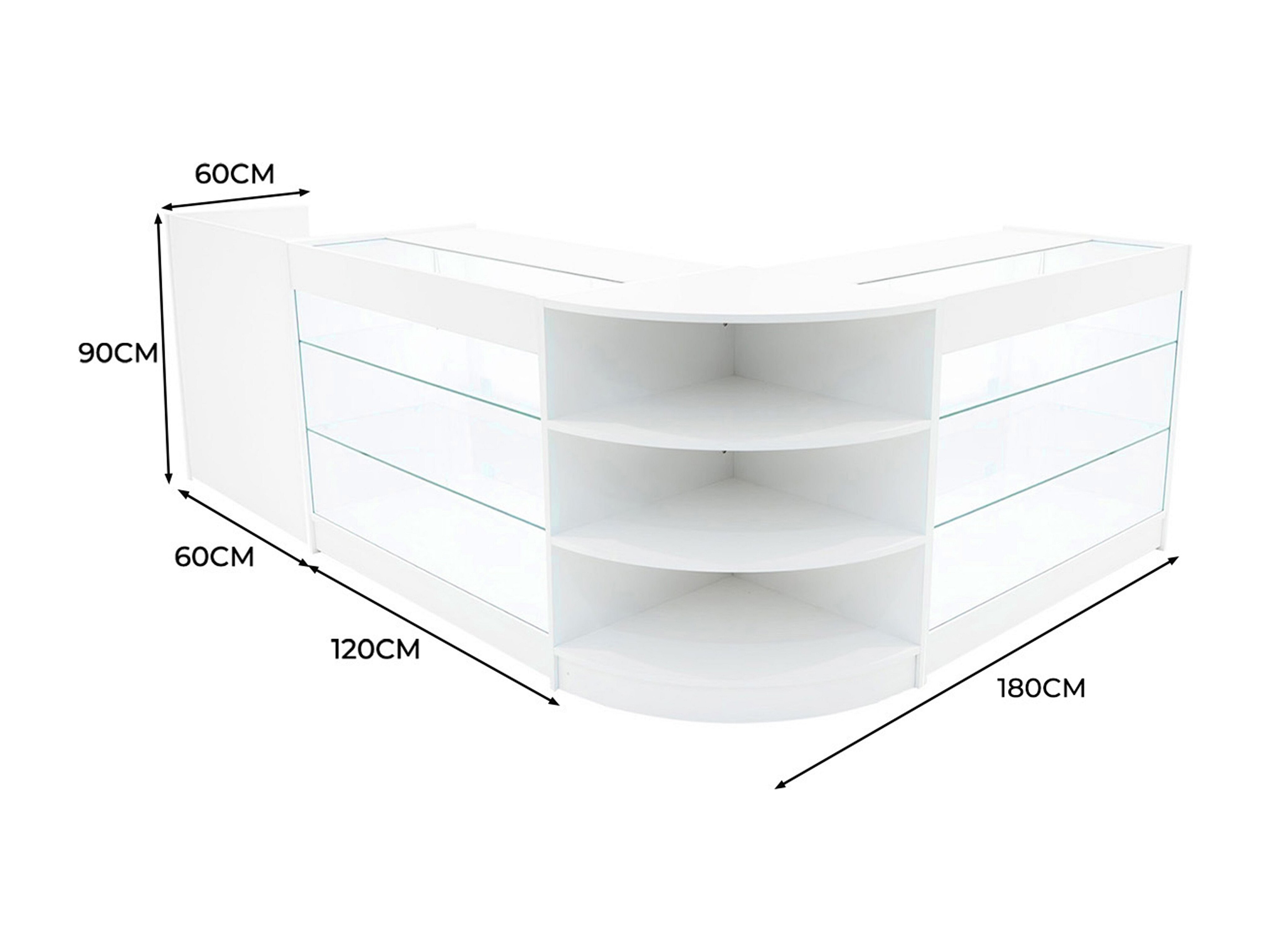 Alle toonbanken zijn vervaardigd uit hoogwaardig MDF met een duurzame witte melamine afwerking, wat zorgt voor langdurige prestaties en een frisse, moderne uitstraling. Het uniforme materiaalgebruik en de afwerking creëren een samenhangende look in uw toonbankopstelling, terwijl de gehard glazen elementen van de K1200 een verfijnde afwerking geven aan de belangrijkste presentatievlakken.