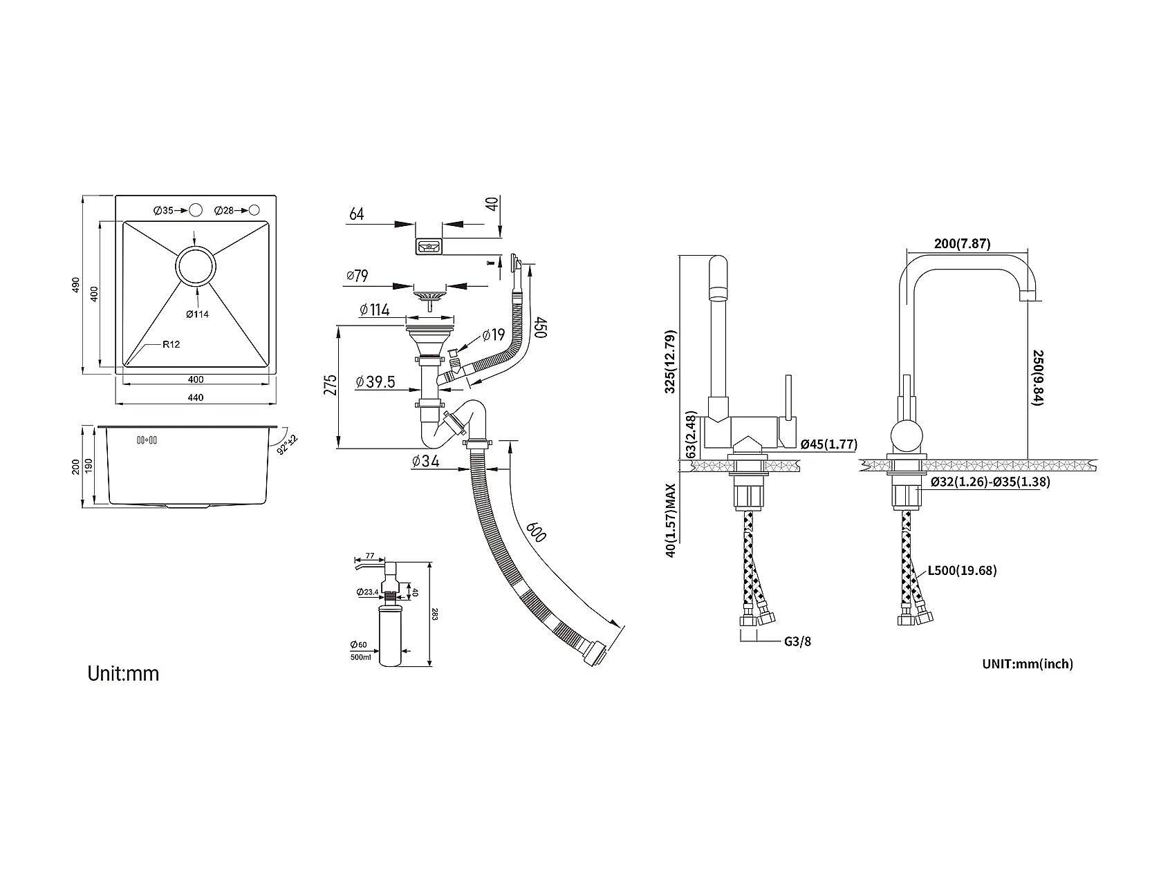 Aanrecht 1Bak Zilver,44*49*20 CM,met VerdelerZeep, RVS + Keukenmengkraan met Uittrekbare Douchekop Donkergrijs 360 ° Draaibaar
